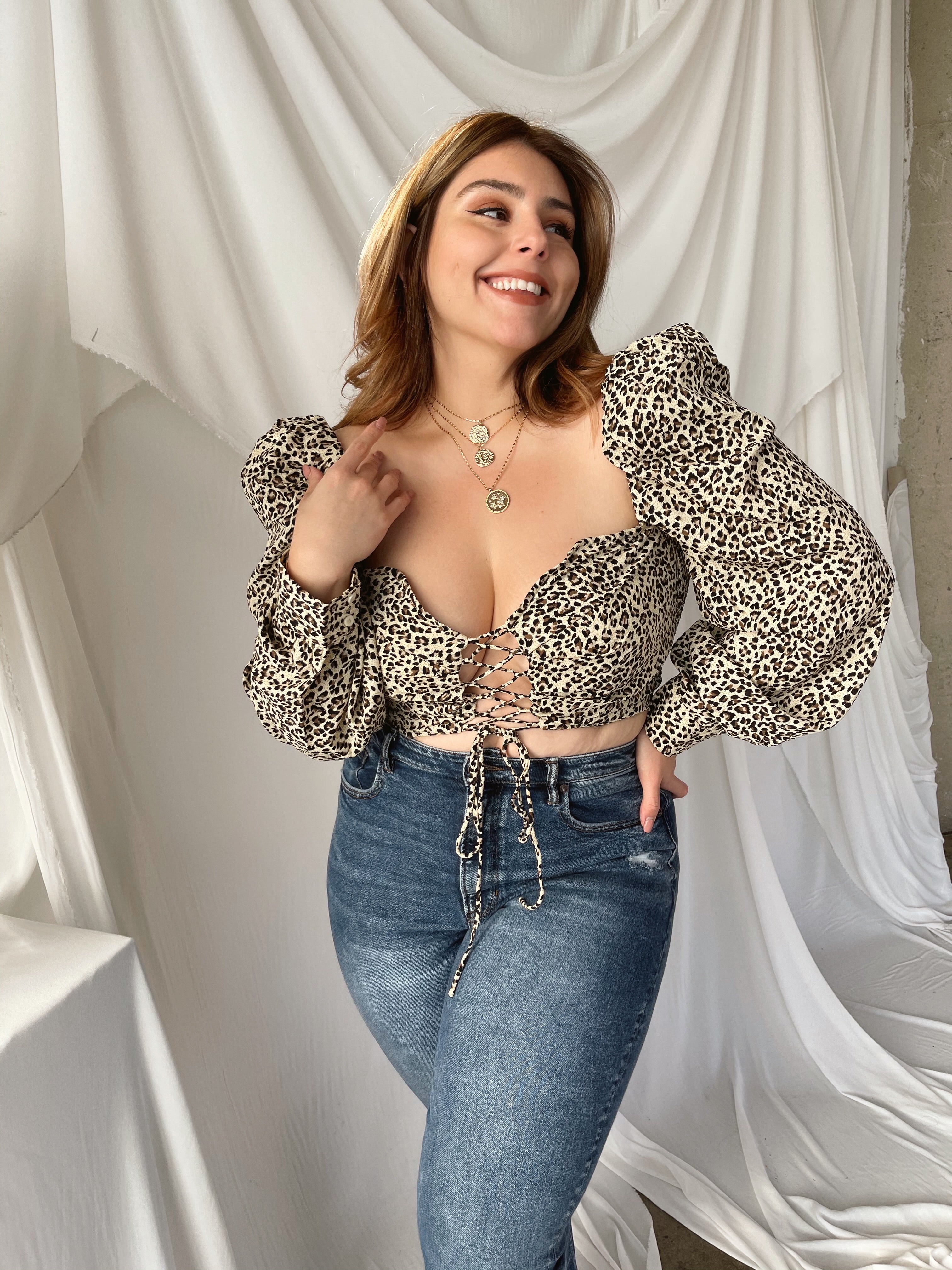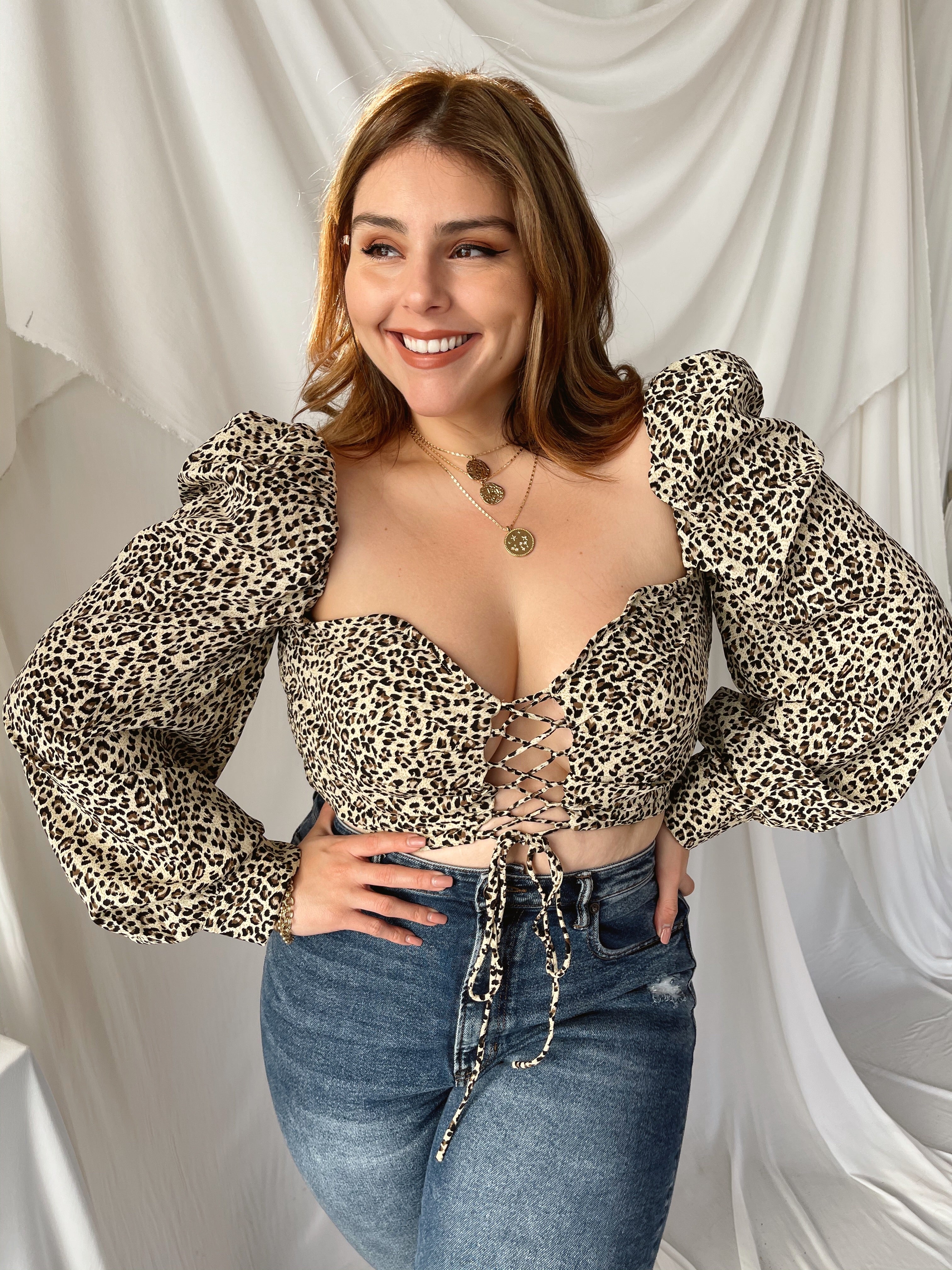 Let them stop and stare in the TATIANA. This Leopard print satin puff sleeve top features an adjustable criss cross design in the front and smocking in the back for extra stretch. This top has mild boning and a sweetheart neckline and button closure on the sleeves. The sleeve doesn't have elastic, size up if you're on the cusp. This top is a MUST HAVE, can be worn on the shoulders or our fav off shouldered! We paired it with our fav jeans and kitten heels.