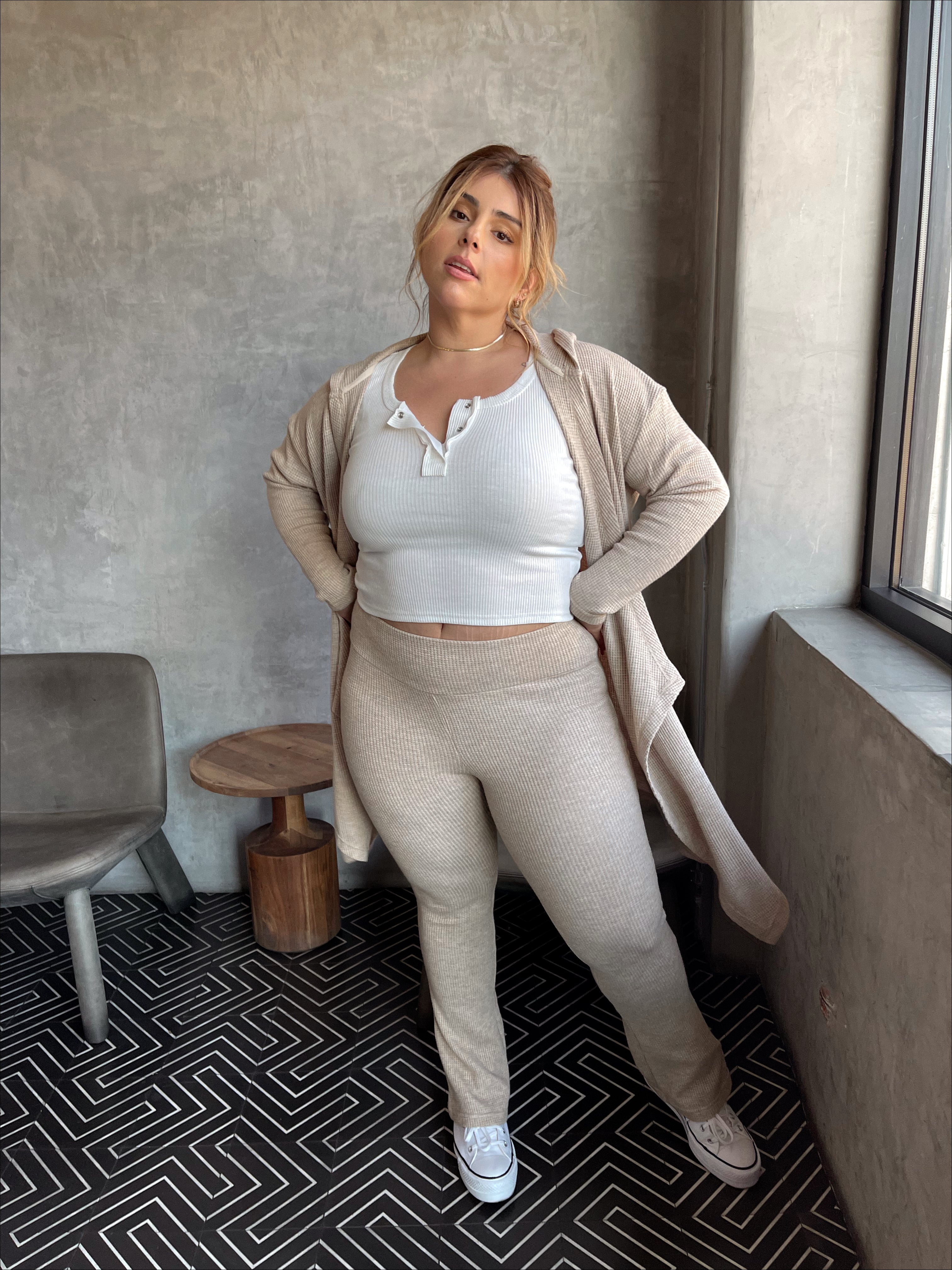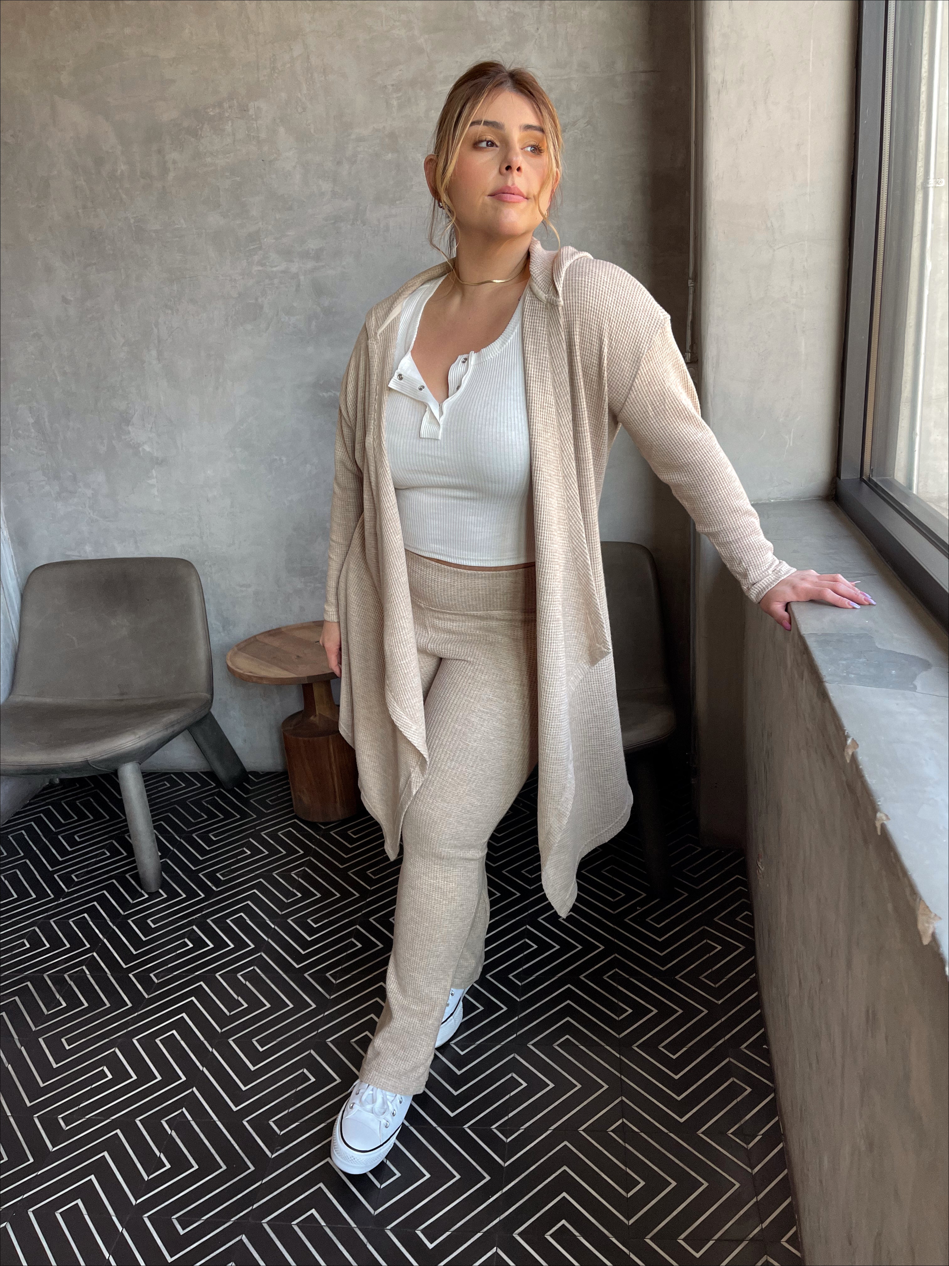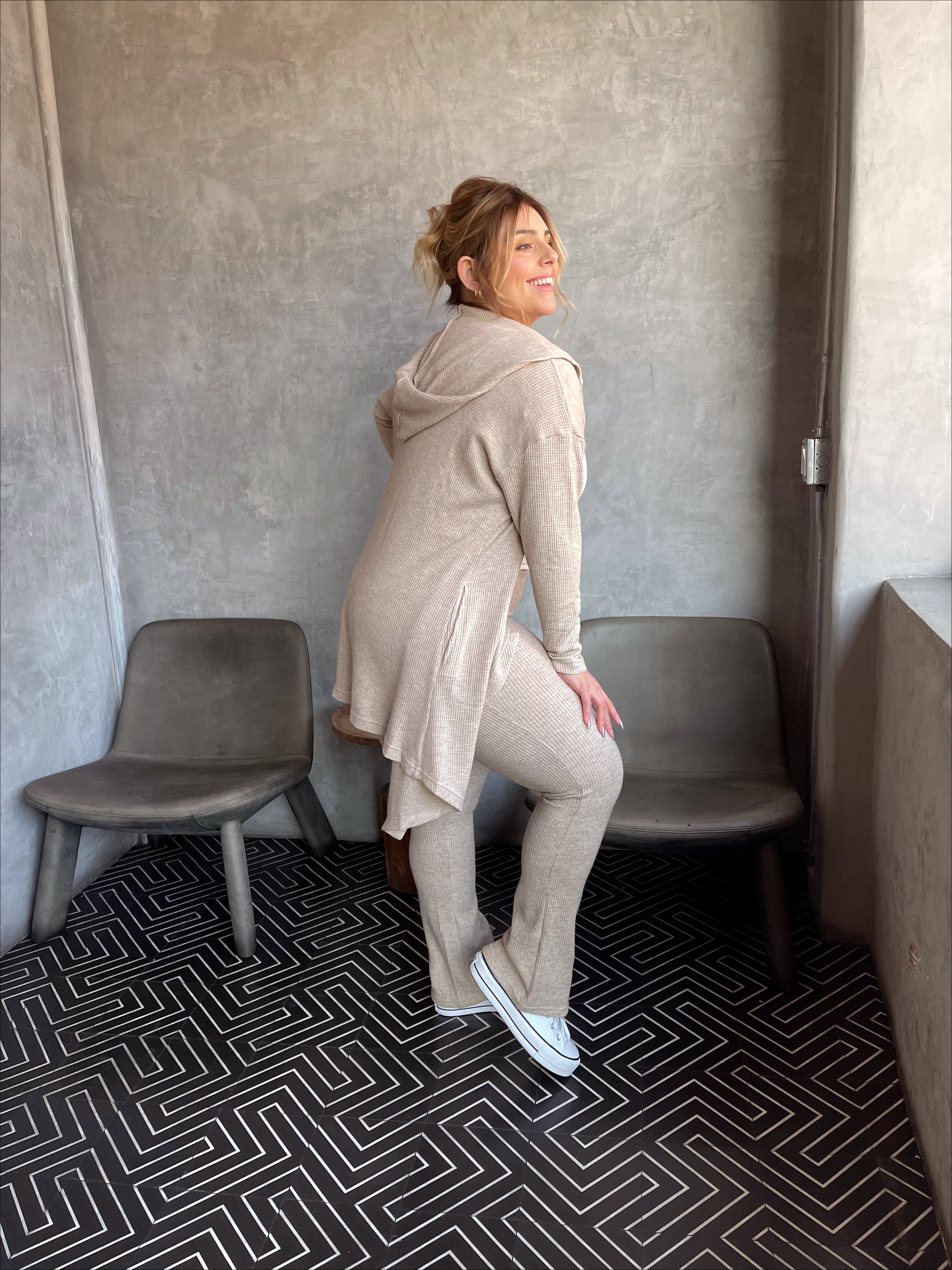 Make the rounds in this ultra luxe set, perfect for a day out or night in! Soft brushed waffle knit fabric, the cardigan offers a classic fit with a hood, pockets and a draped open front. The slightly flared pant offers a wide band for comfort. Style with your fav sneakers or stay in and lounge.