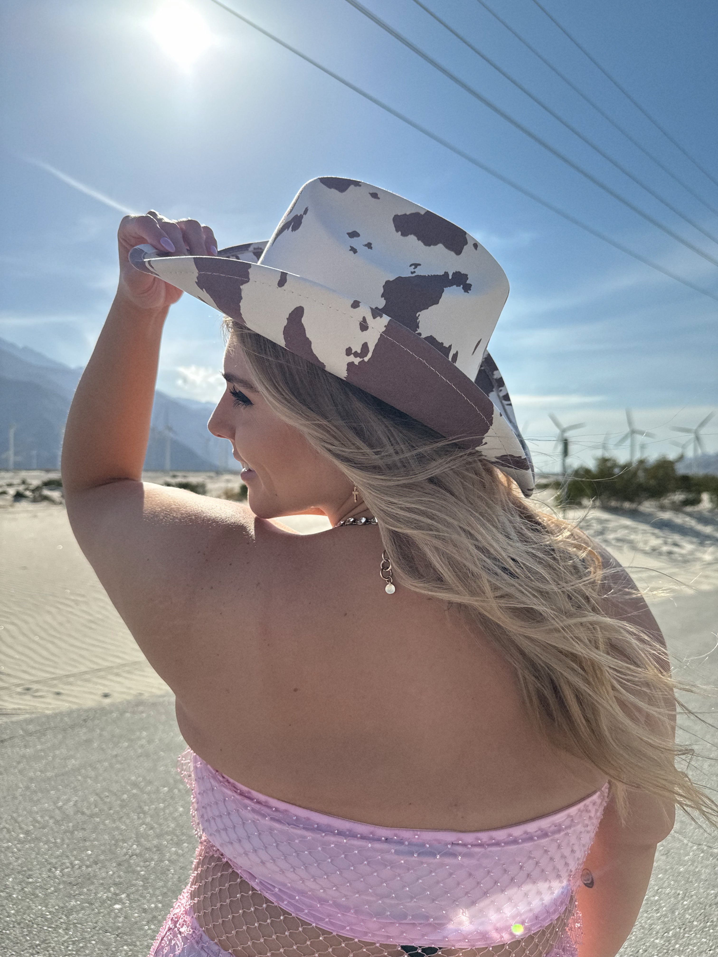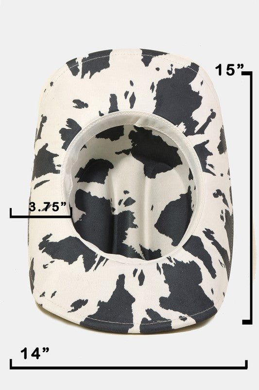 Giddy up in style with this faux suede cowboy hat, featuring a playful cow print pattern. Made to resemble genuine suede, this hat will add a touch of quirkiness to any outfit. Yeehaw!