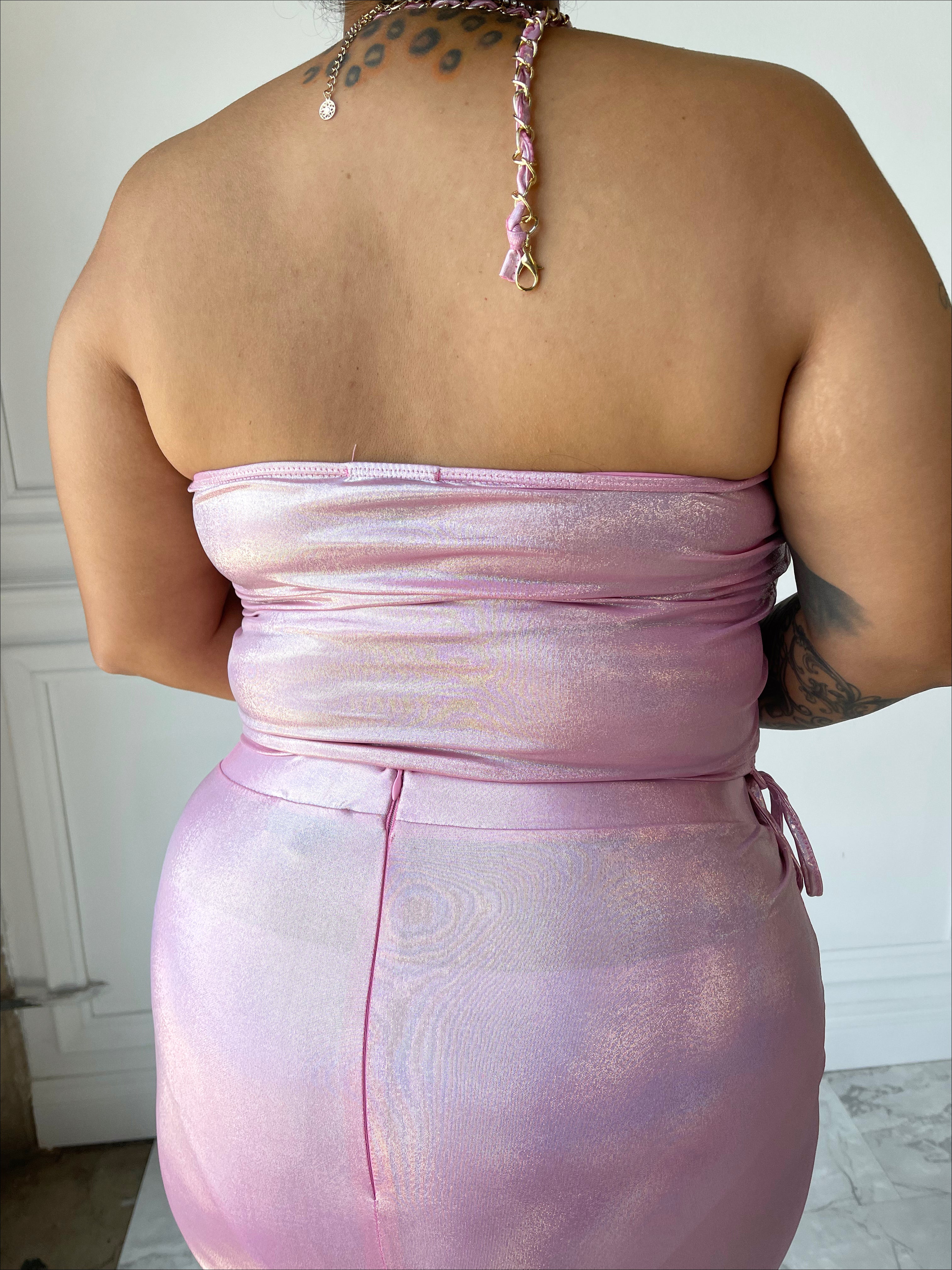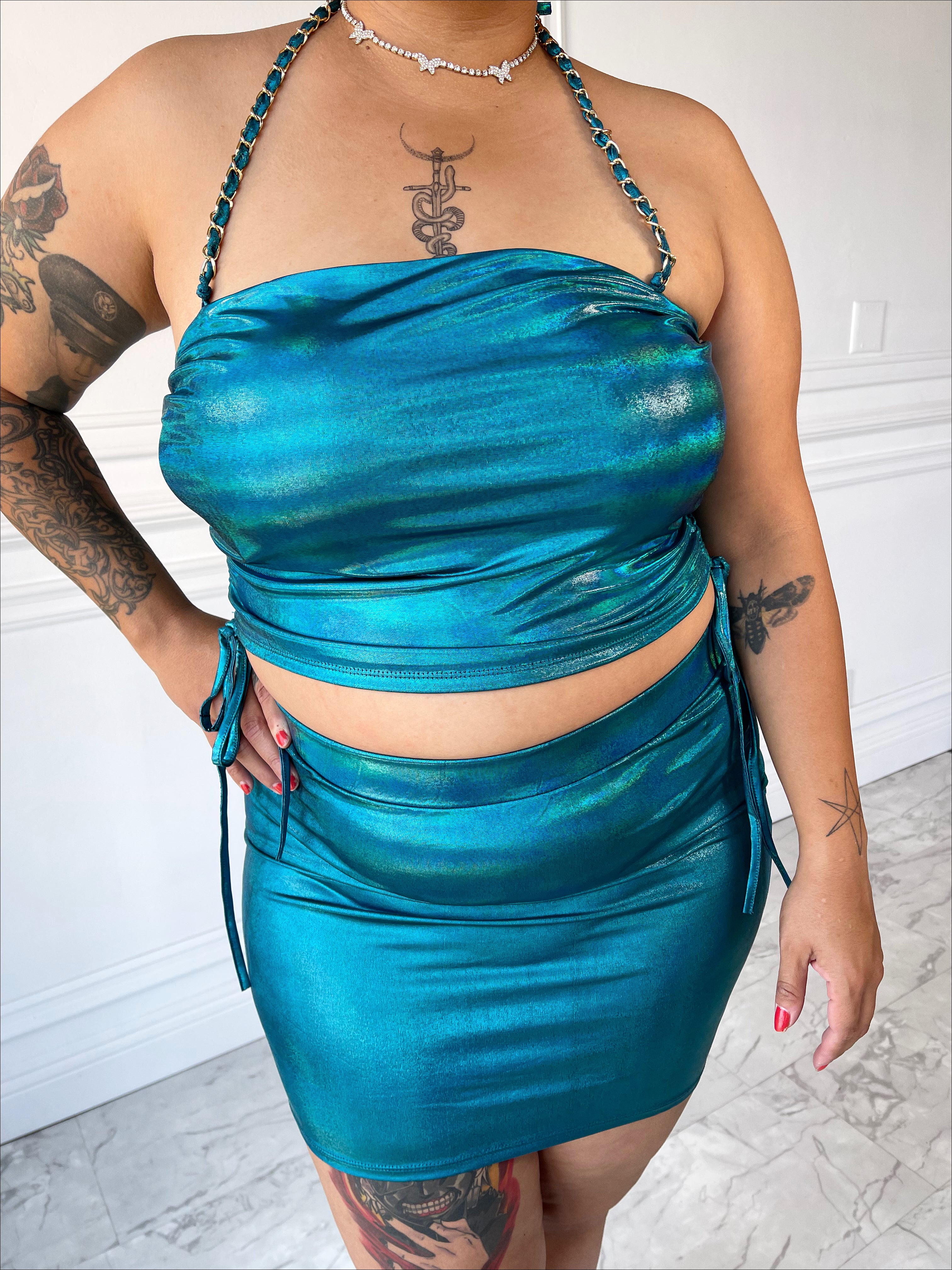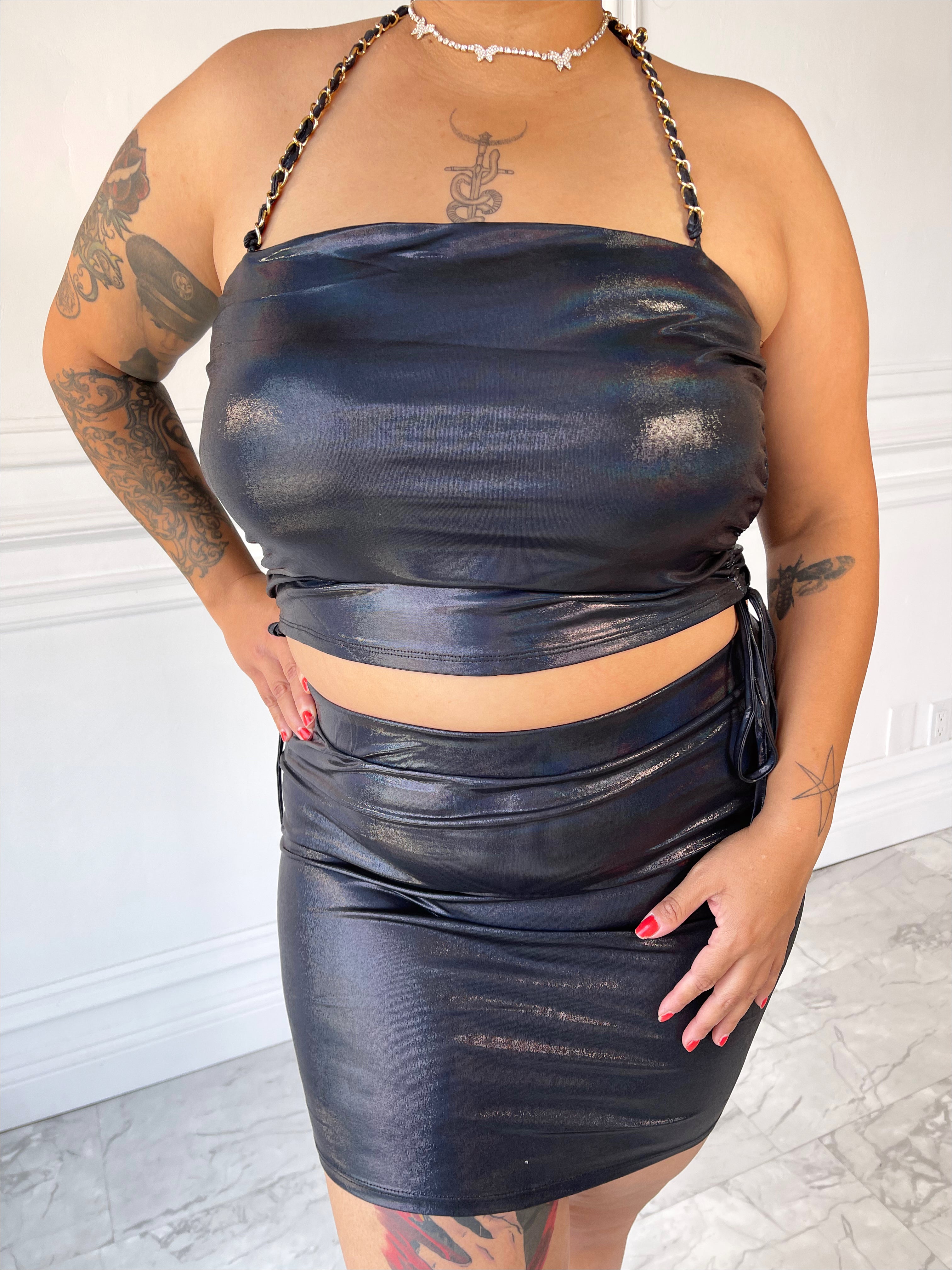 Make a statement in the LATE TO THE PARTY set. Features a tube top halter top with gold chain accent. Zipper closure on the mini skirt! It’s giving us Romy and Michele vibes!
