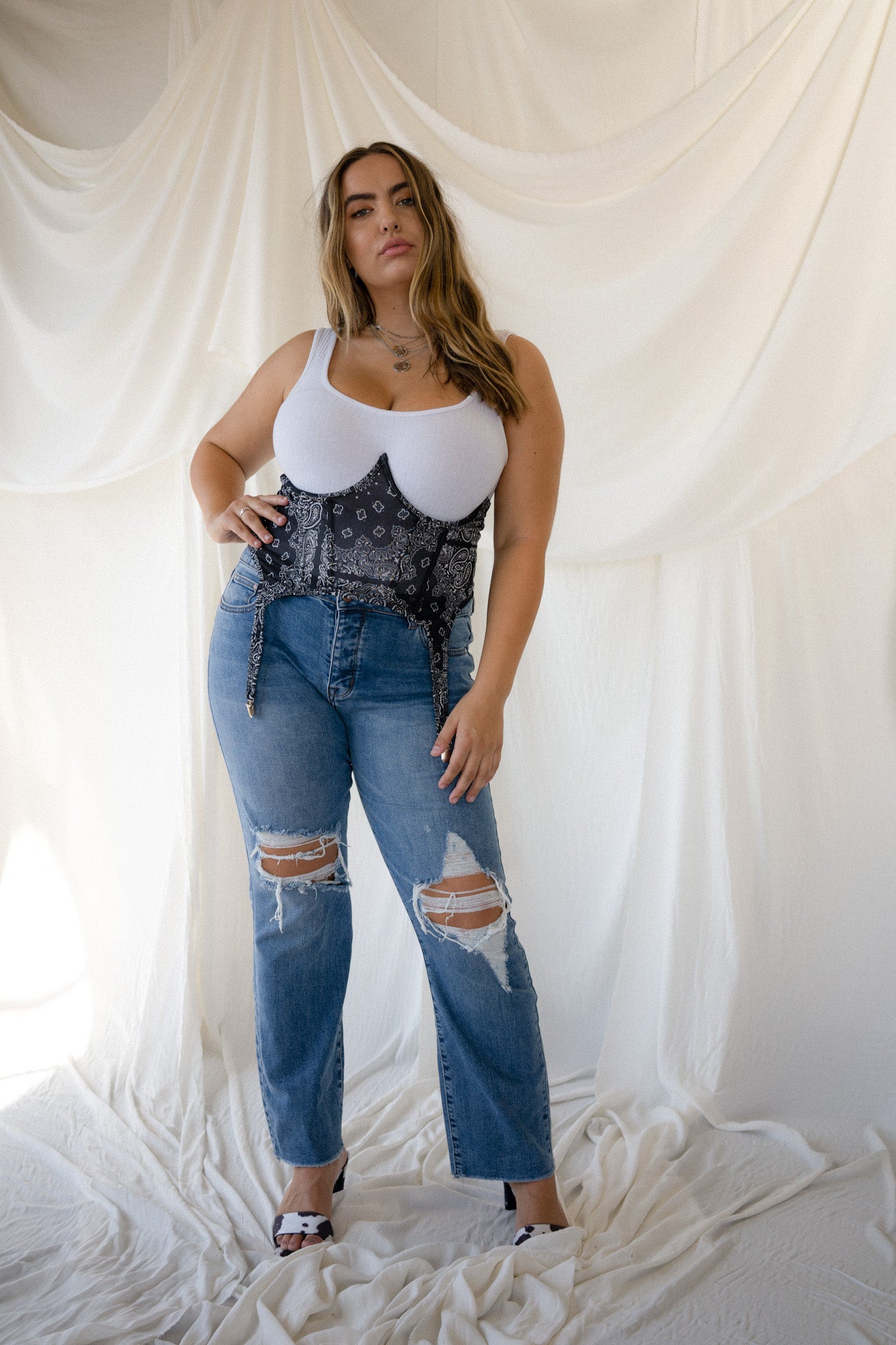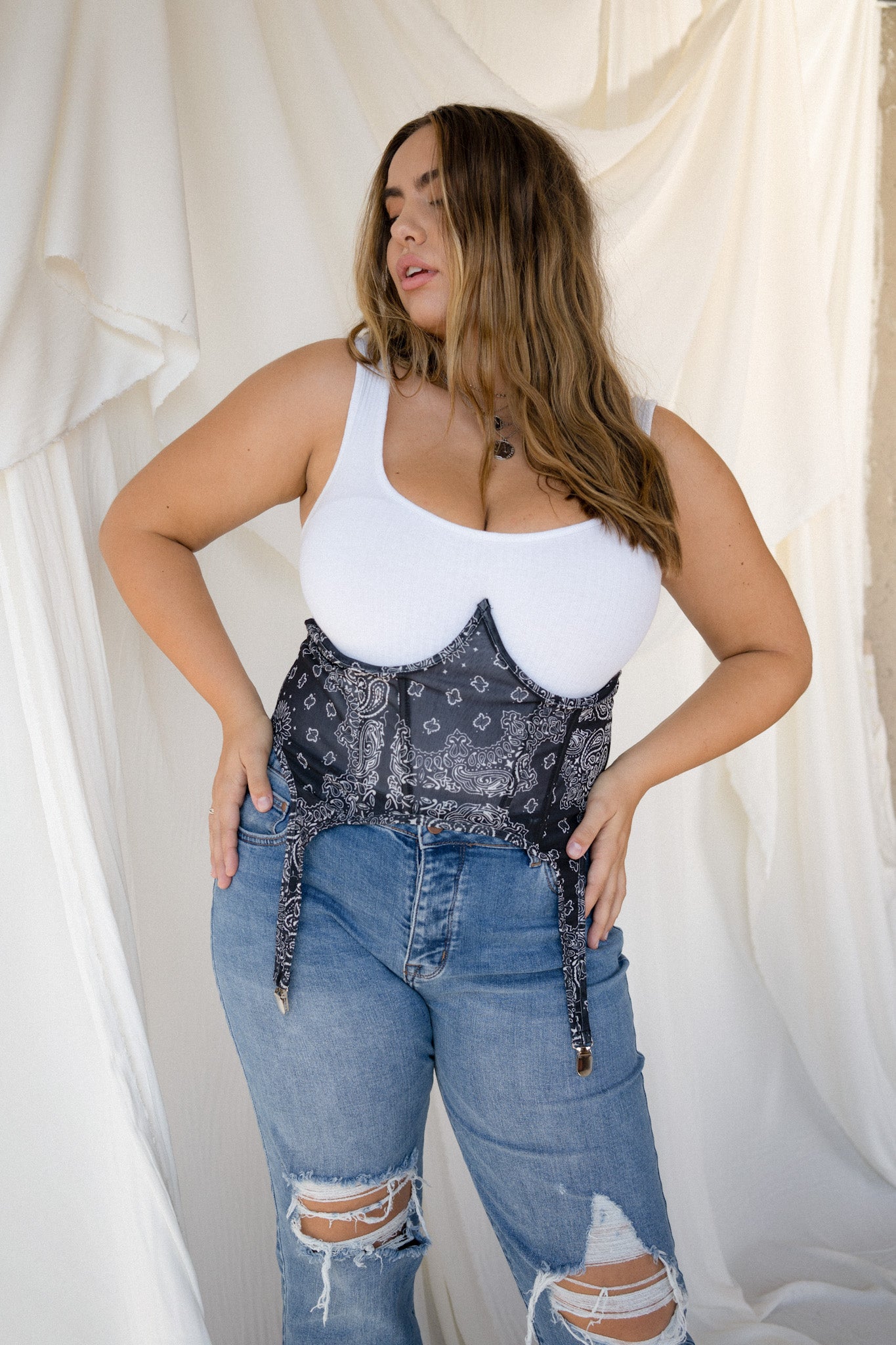 The LITA Under Bust Corset is strapless and features underwire, back zipper closure and stocking clips. The mesh sheer material also has mild boning for the perfect fit! The bandana print gives it a western flair. Style it with a black blazer and your favorite jeans or leather pants for the perfect OOTD. (White top not included)