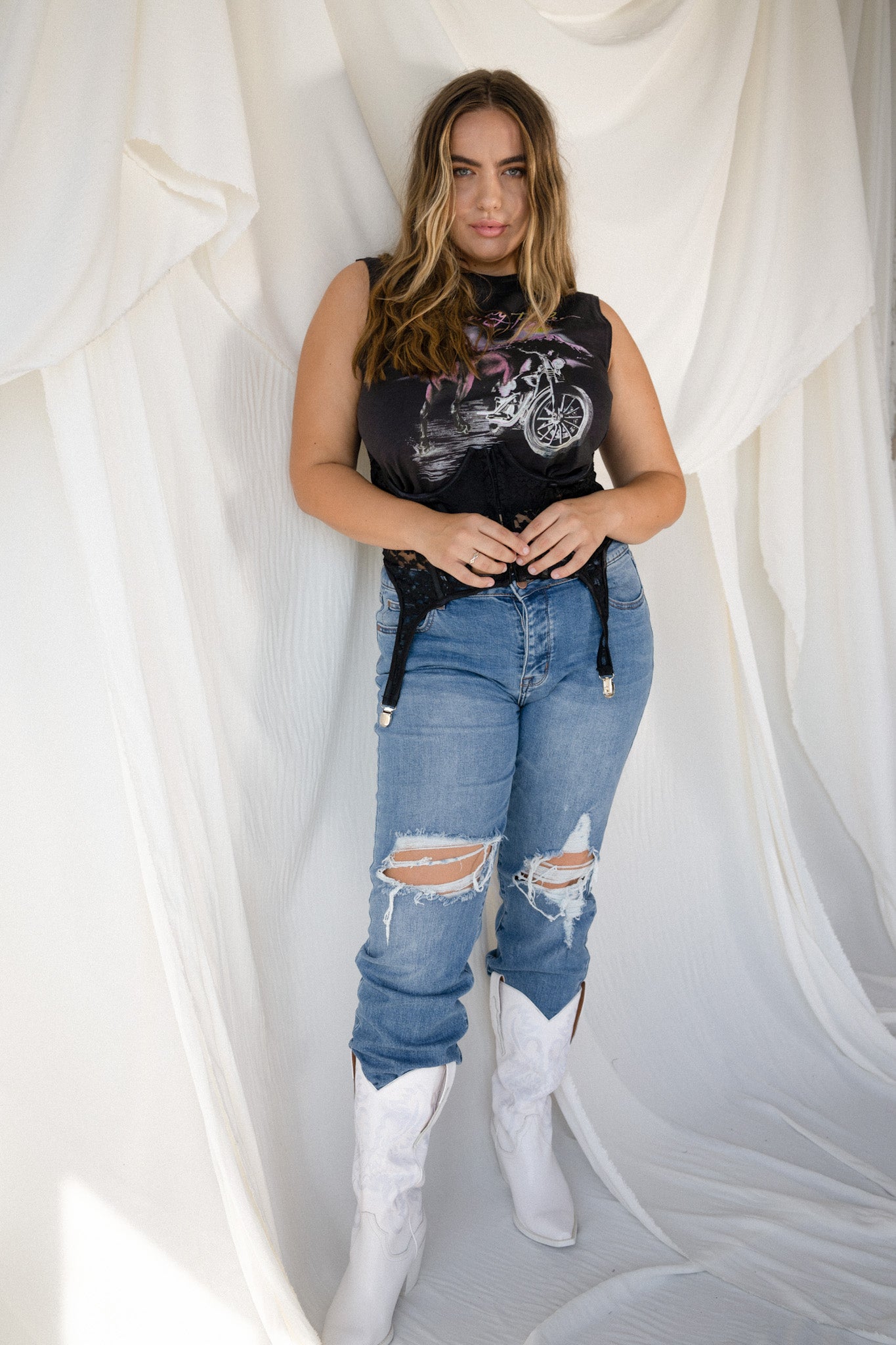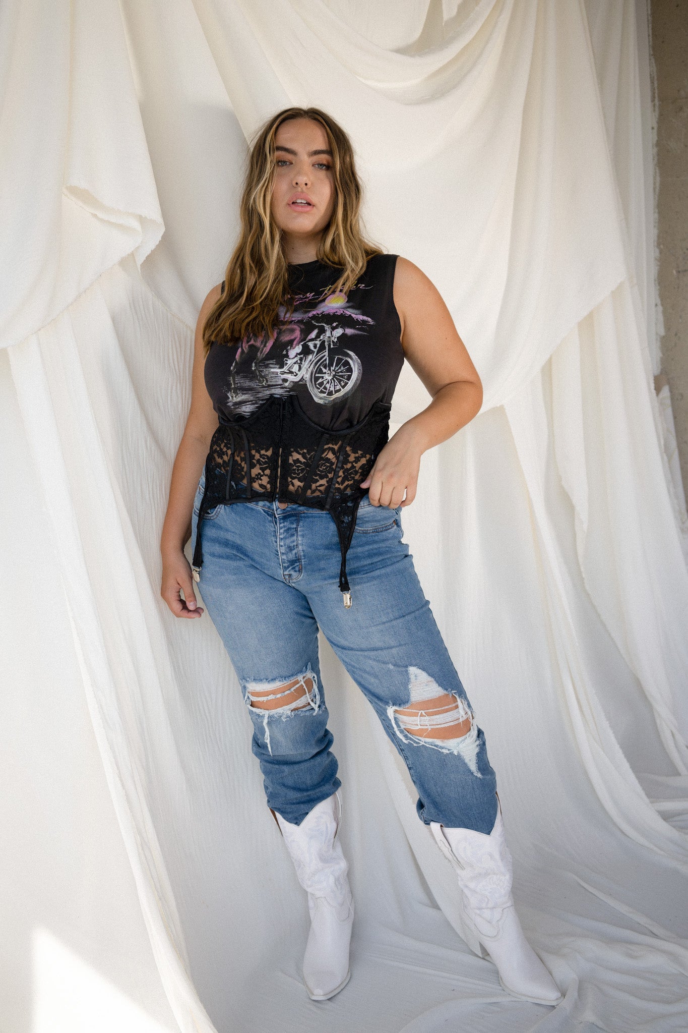 The LITA Under Bust Corset is strapless and features underwire, back zipper closure and stocking clips. The mesh sheer material also has mild boning for the perfect fit!  Style it with a black blazer and your favorite jeans or leather pants  for the perfect OOTD. (top not included)
