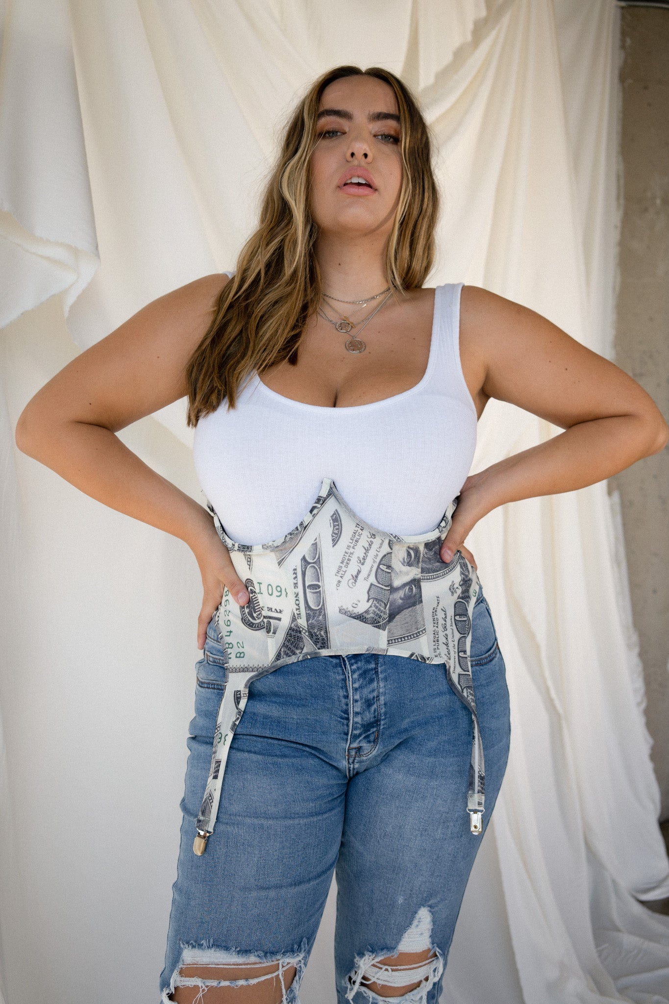 The LITA Under Bust Corset is strapless and features underwire, back zipper closure and stocking clips. The mesh sheer material also has mild boning for the perfect fit!  Style it with a black blazer and your favorite jeans or leather pants  for the perfect OOTD. (White top not included)
