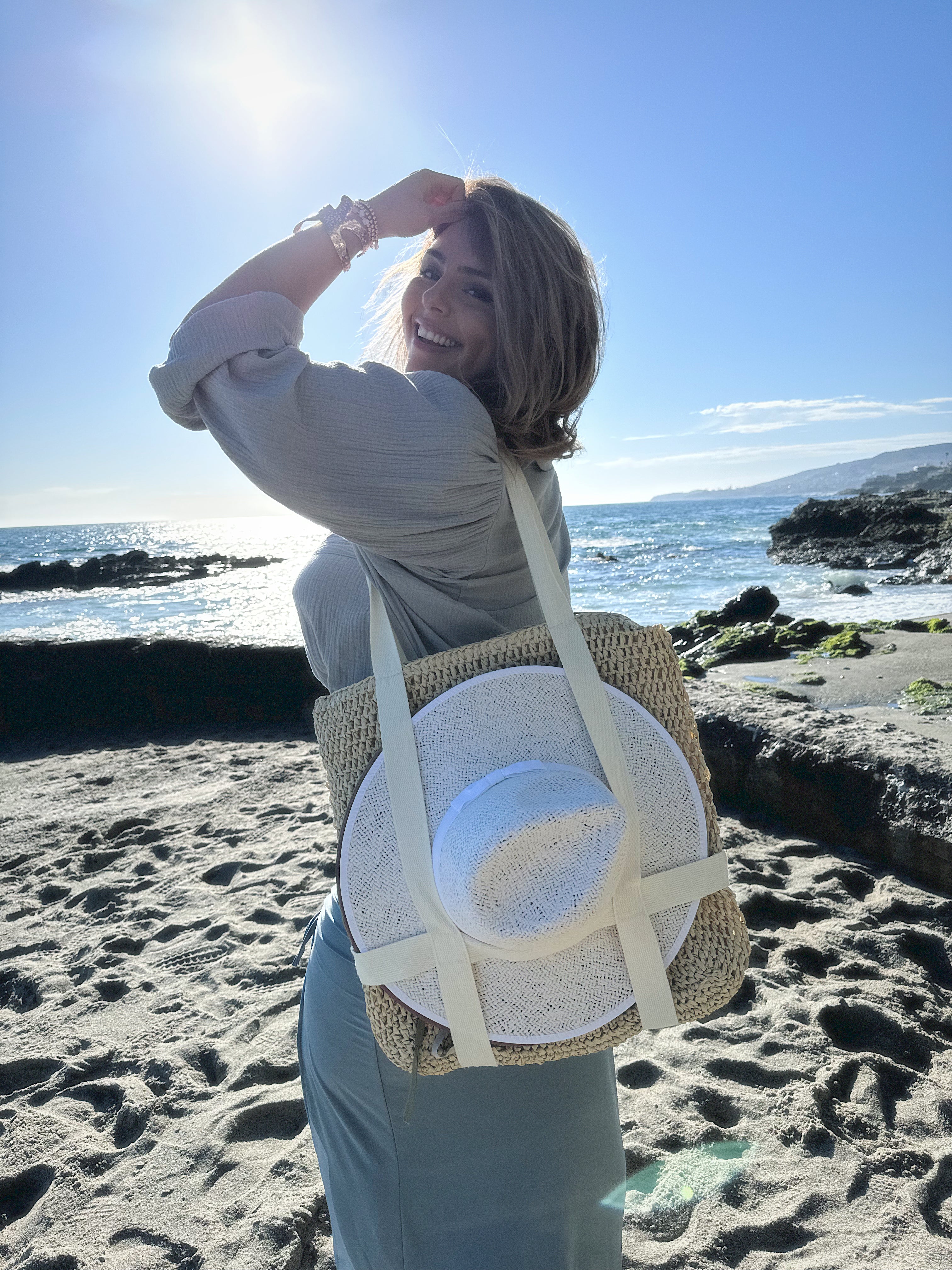 Stay cool and stylish with our unique straw braided hat holder tote bag! Perfect for a day at the beach, this bag keeps you hands-free and your hat protected. No more fussing with hat boxes or carrying multiple bags. Keep it playful and functional with our tote bag! (hat not included)