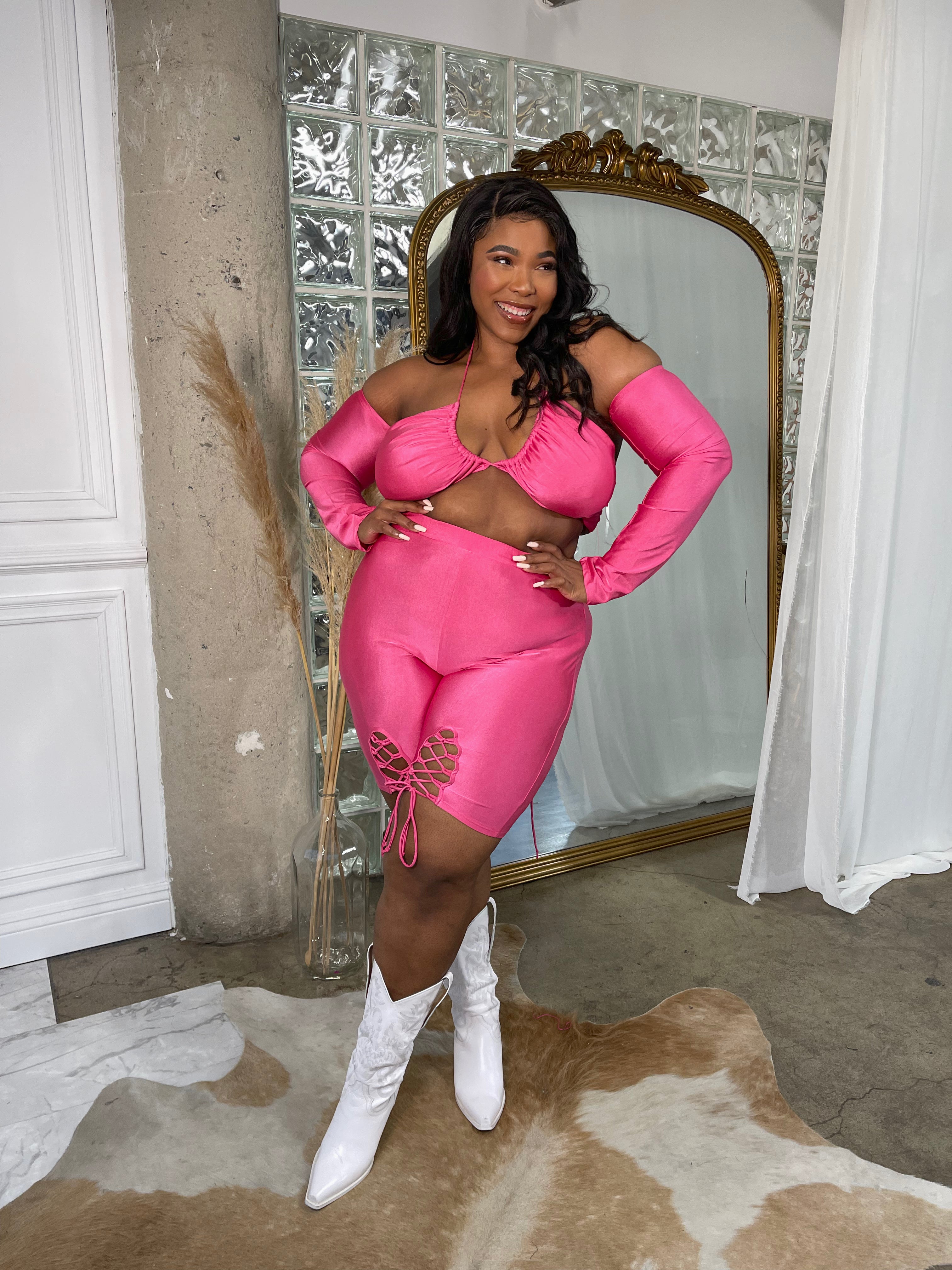 Add this to cart for any festival you're attending. The RAVEY comes with a pair of biker shorts with tie up detail, a halter bikini top completely adjustable and faux sleeves. Style together or separate with jeans or an oversized shirt.
