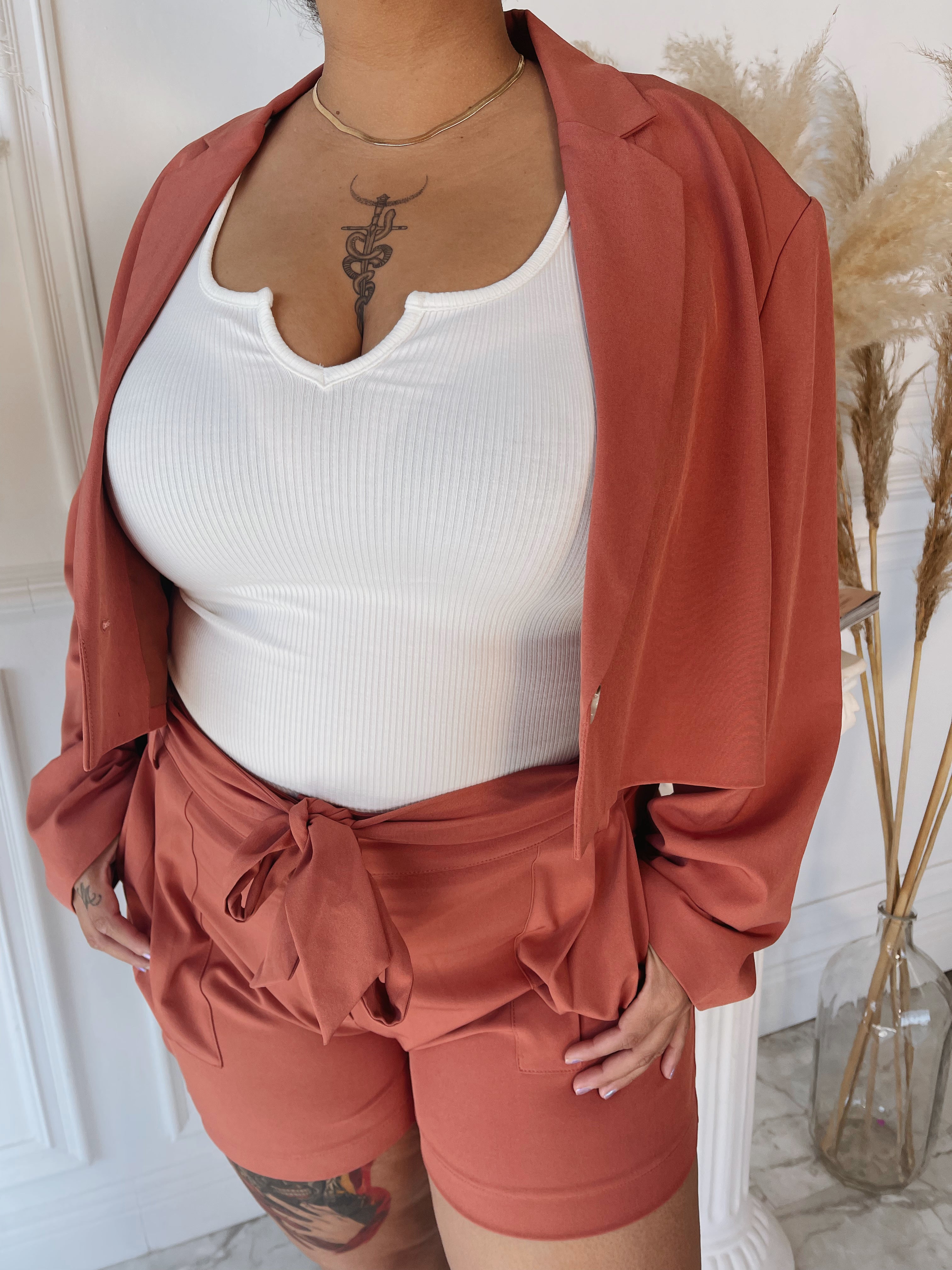 Perfect Duo just landed, meet the TERRA set. Features and oversized cropped blazer, paperbag style shorts with pockets and self tie accent belt detail. Style with platform covers and a tank for a day vibe or your fav strappy heels with gold jewelry for date night.