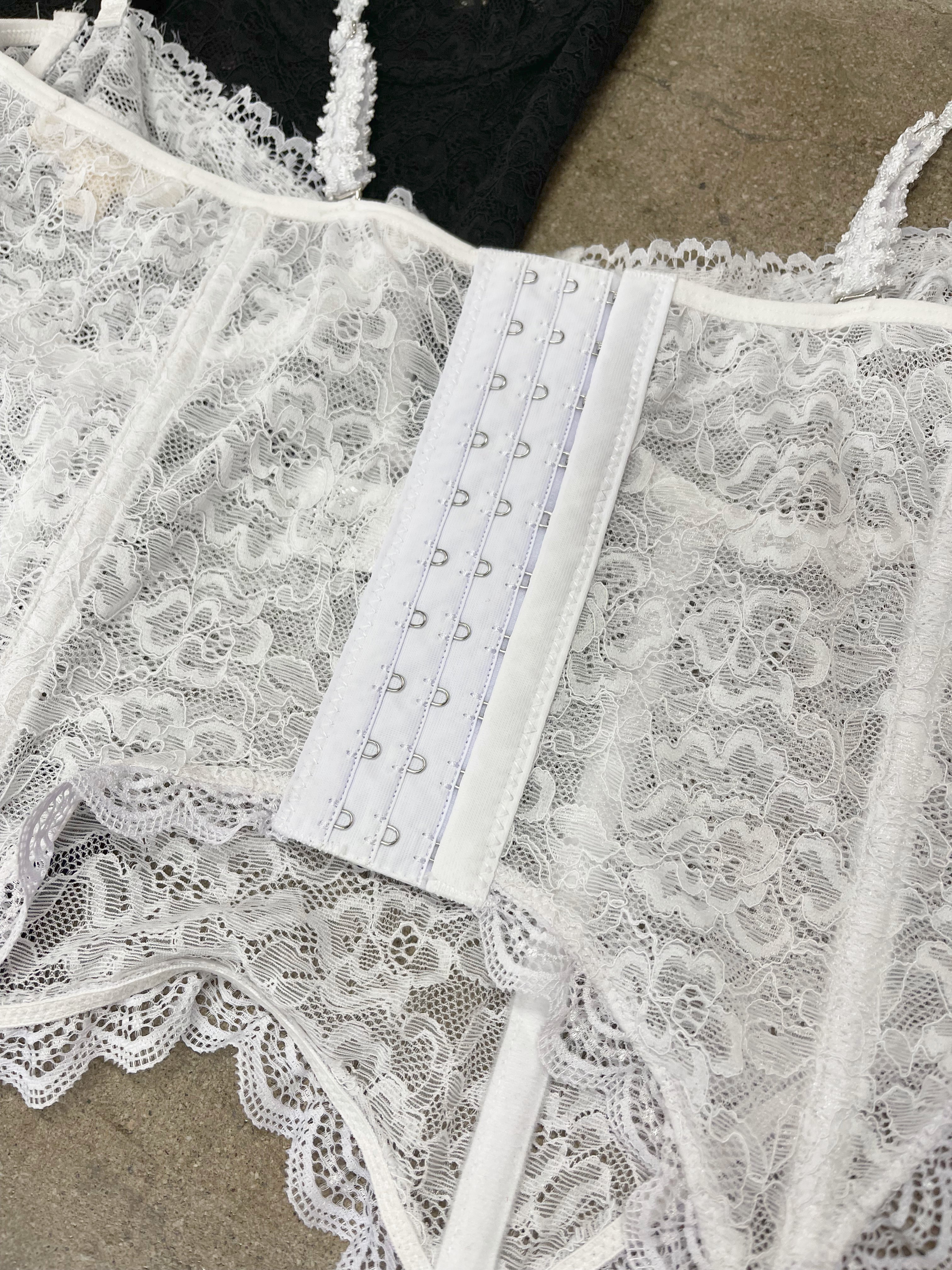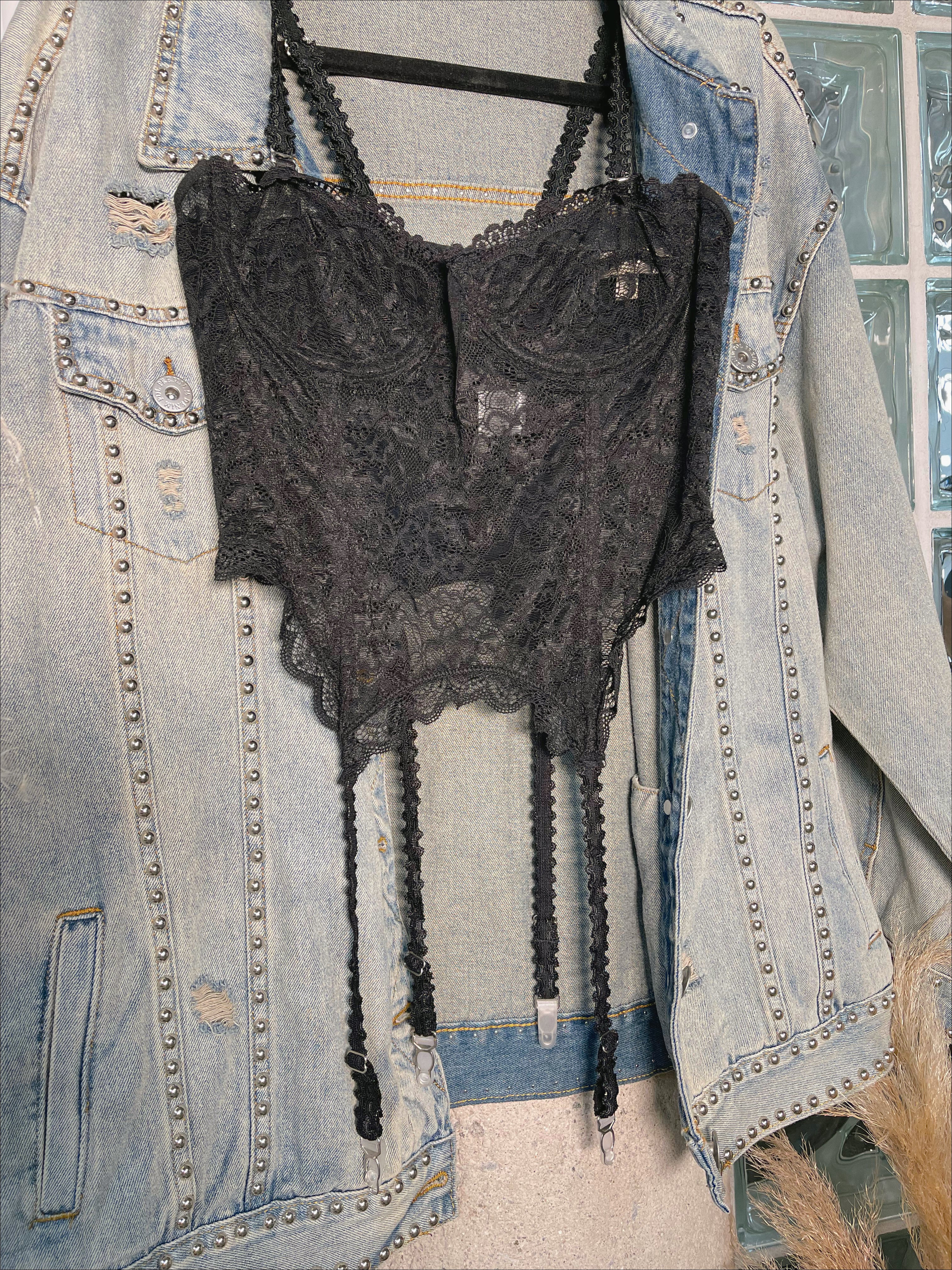 The VIVI is a delicate lace bustier that features a demi cup fit and garter straps. Adjustable and removable straps, this top is very lux. Wear it under a dress shirt for the perfect peek a boo. Very stretchy, mild boning throughout and hook eye closure in the back.