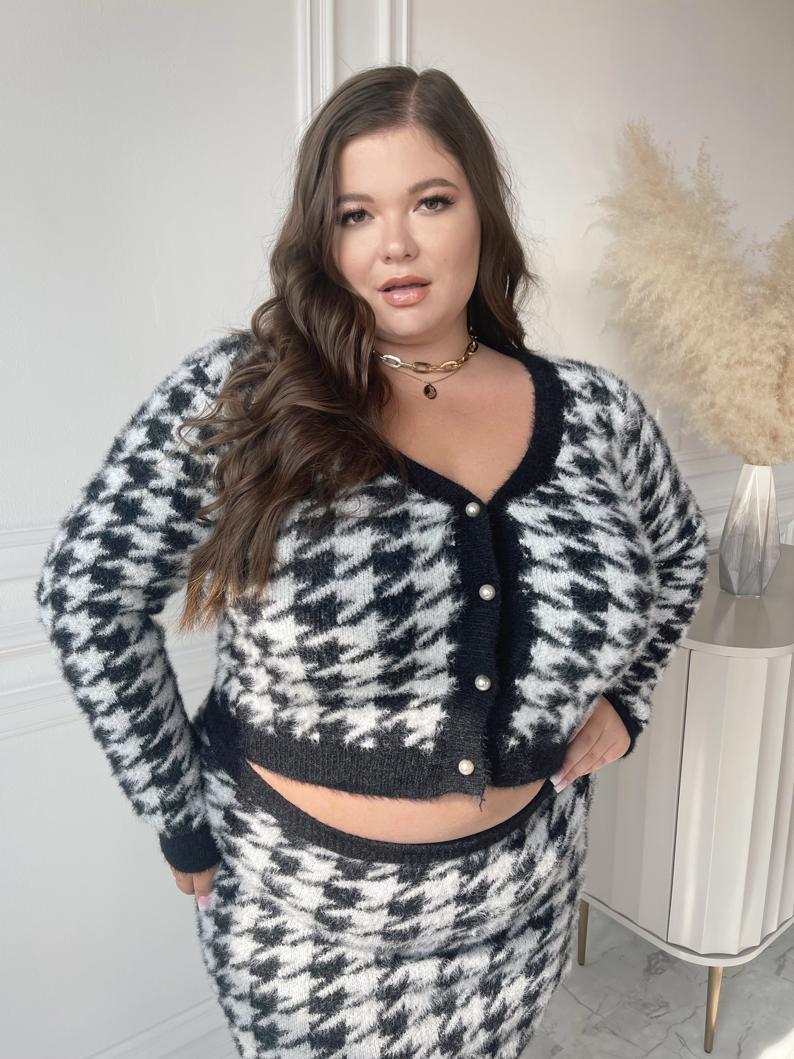 Ready for Fall? We are in the BLAIR Set. This Black and White 2 piece set features a crop top sweater and a mini skirt. Super soft and stretchy faux fur fabric with pearl like buttons. A total must have, can be styled separately or together!