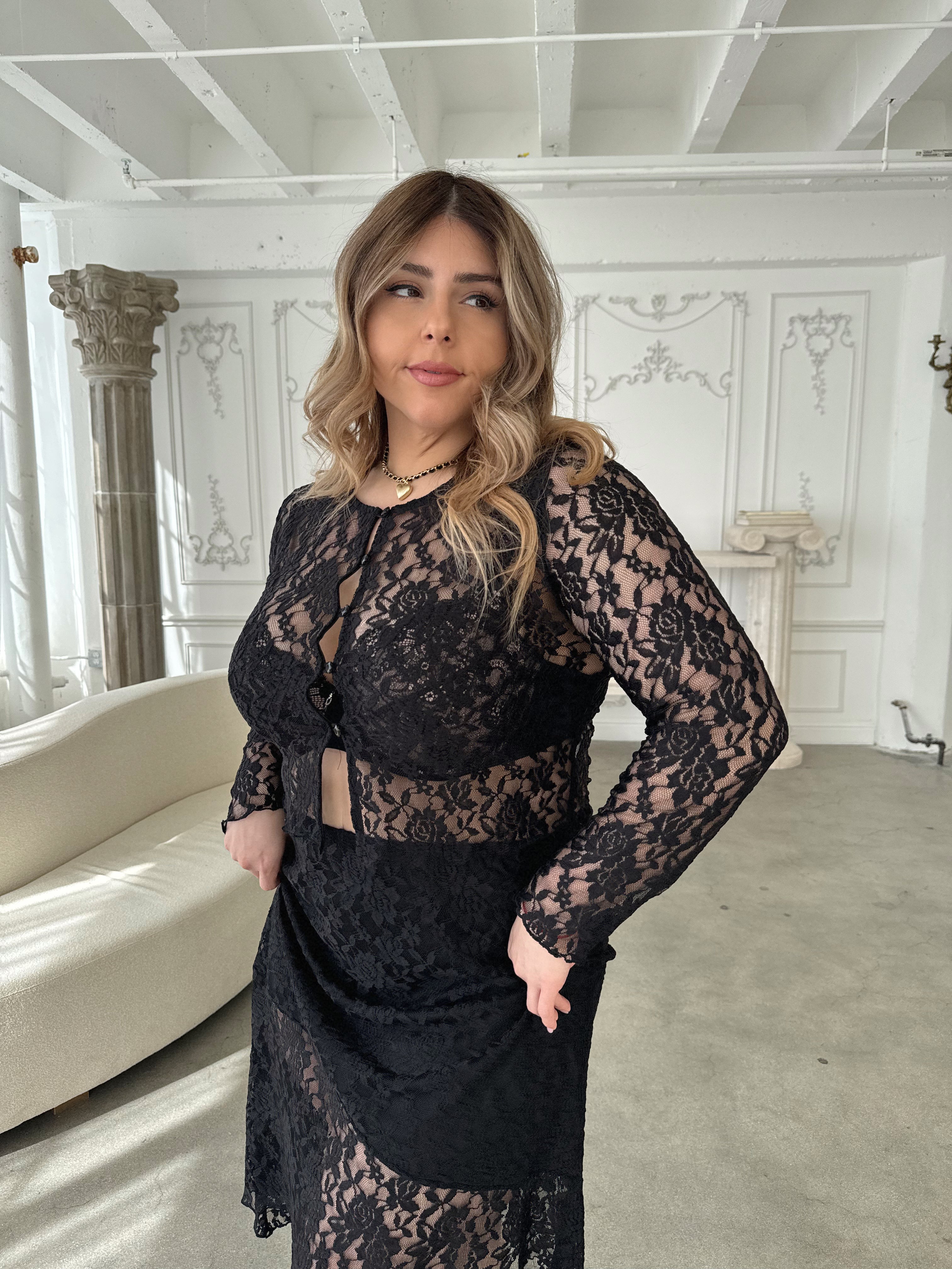 Effortlessly chic, this matching lace set includes a long sleeve crop cardigan with button loop flower buttons and a lace skirt with inside lining. Perfect for a playful yet sophisticated look. Can be styled together or separate!