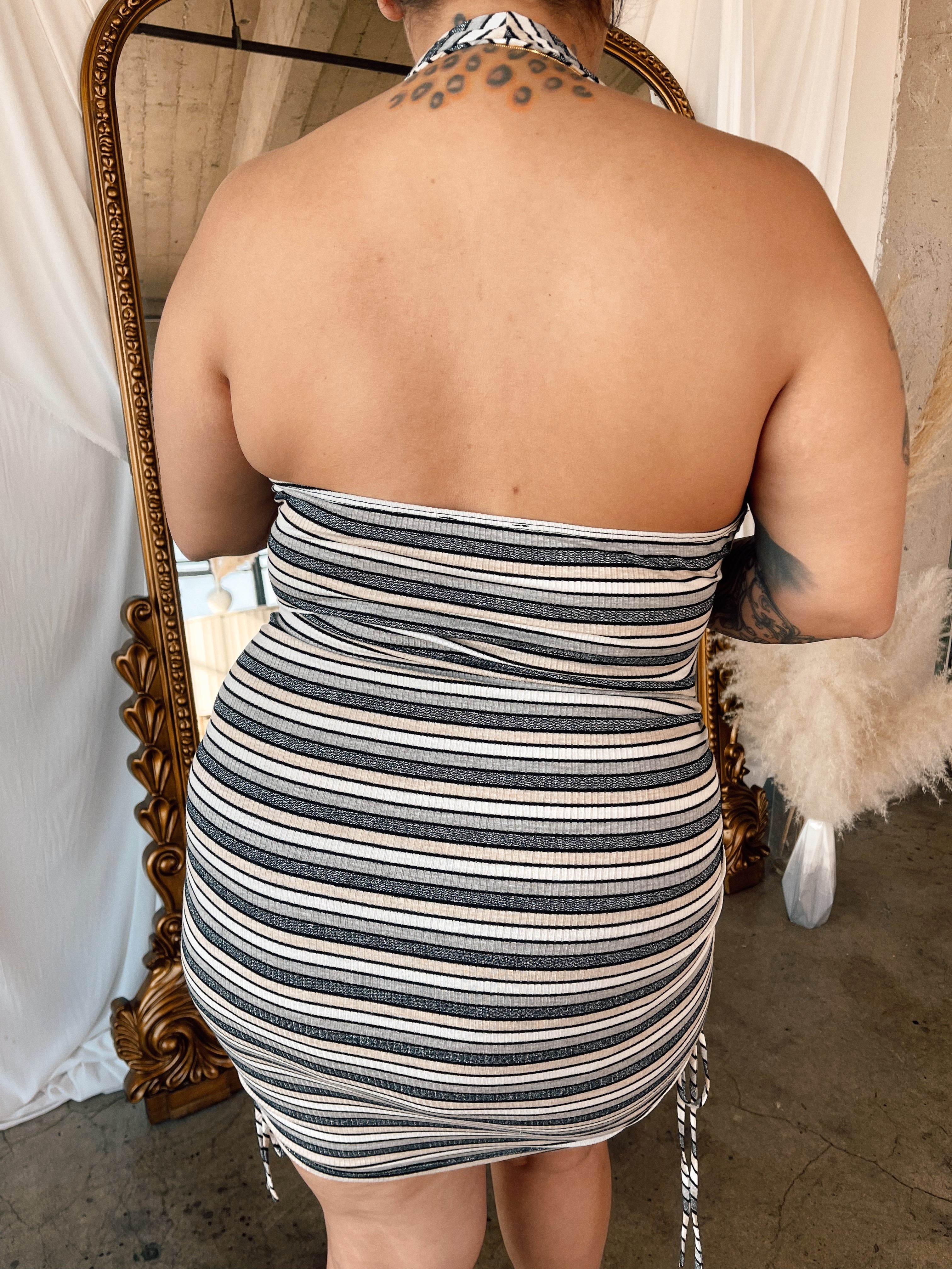 We’re going back to the 70’s with this dress! Features a stripped design with some shimmer to pop. Stretchy cotton with adjustable lengths on both sides. Pair with your fav heels or boots. We added the ROAM WILDE jacket also.