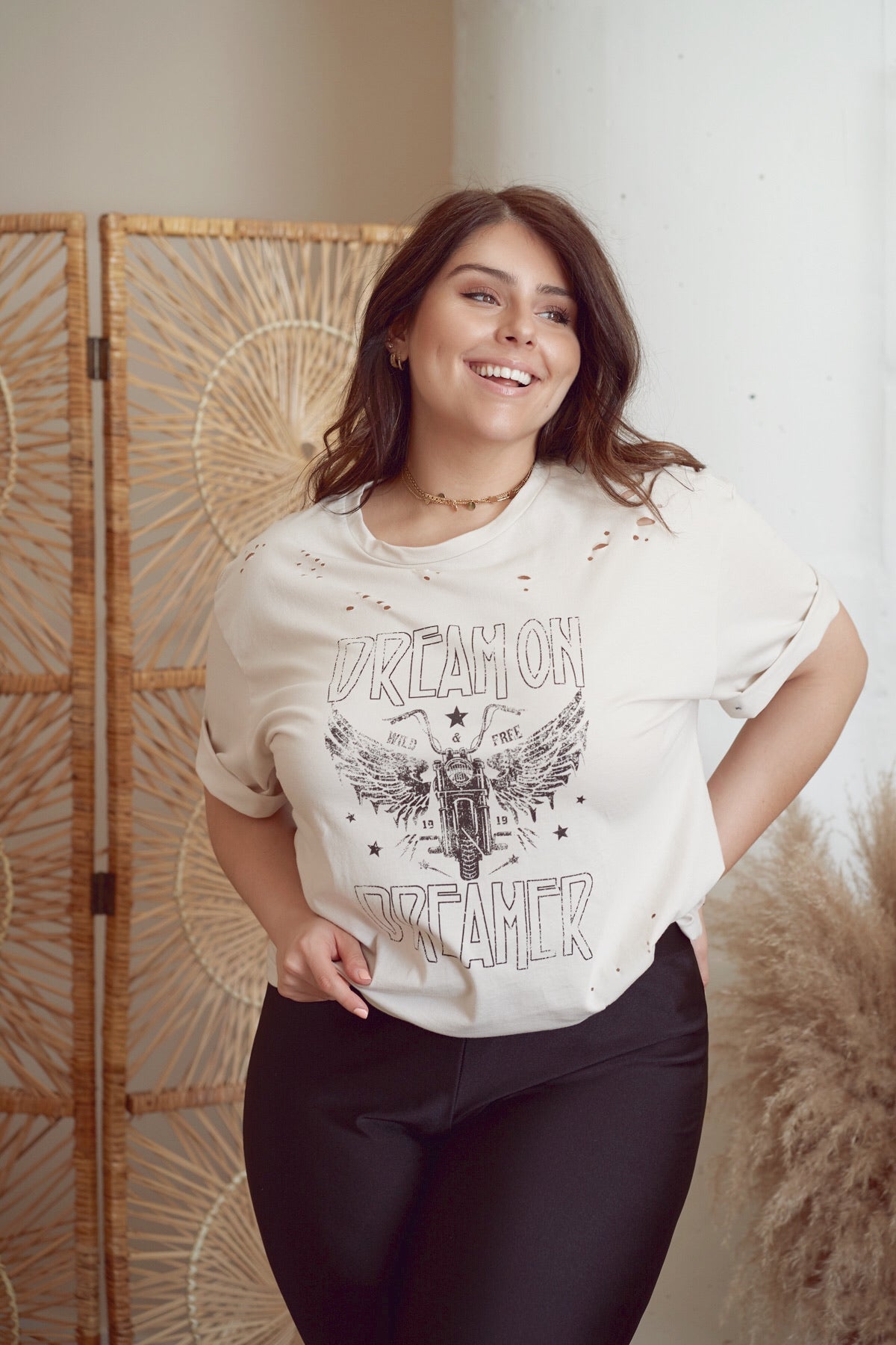 The Dream on Dreamer graphic distressed tee is UNISEX. We styled it with biker shorts, but would also look great with denim shorts/pants. Dress it up with strappy heels or your fav sneakers for the perfect day outfit.