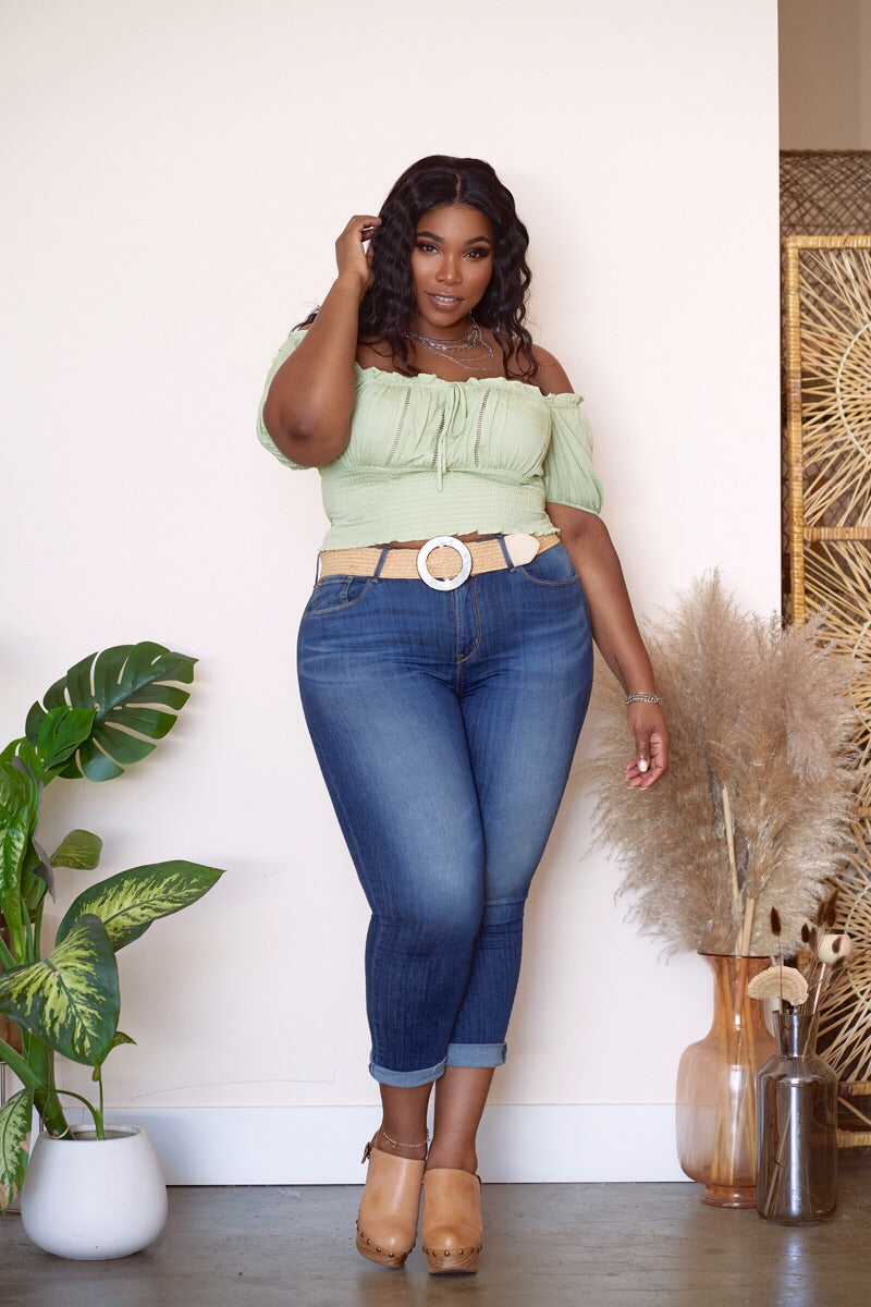 The EVA is a woven crop top featuring a square neckline, short puff sleeves,a faux self-tie closure and a smocked bodice. Perfect with jeans and sneakers.