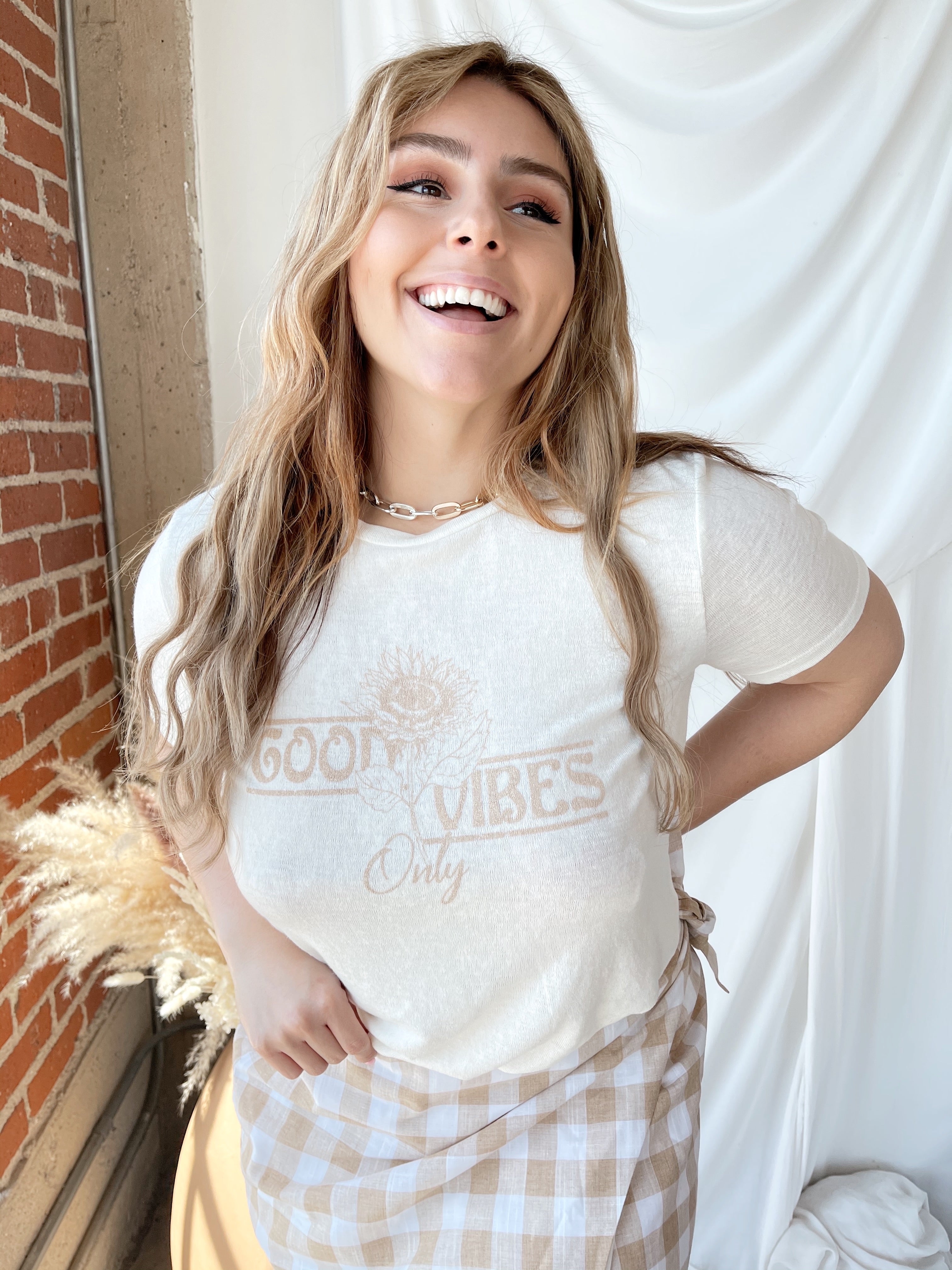 GODD VIBES Only! Daily affirmations and premium cotton tees please. Features a cute graphic and a lot of stretch. We paired it with a plaid skirt, but can be also work with your fav jeans!