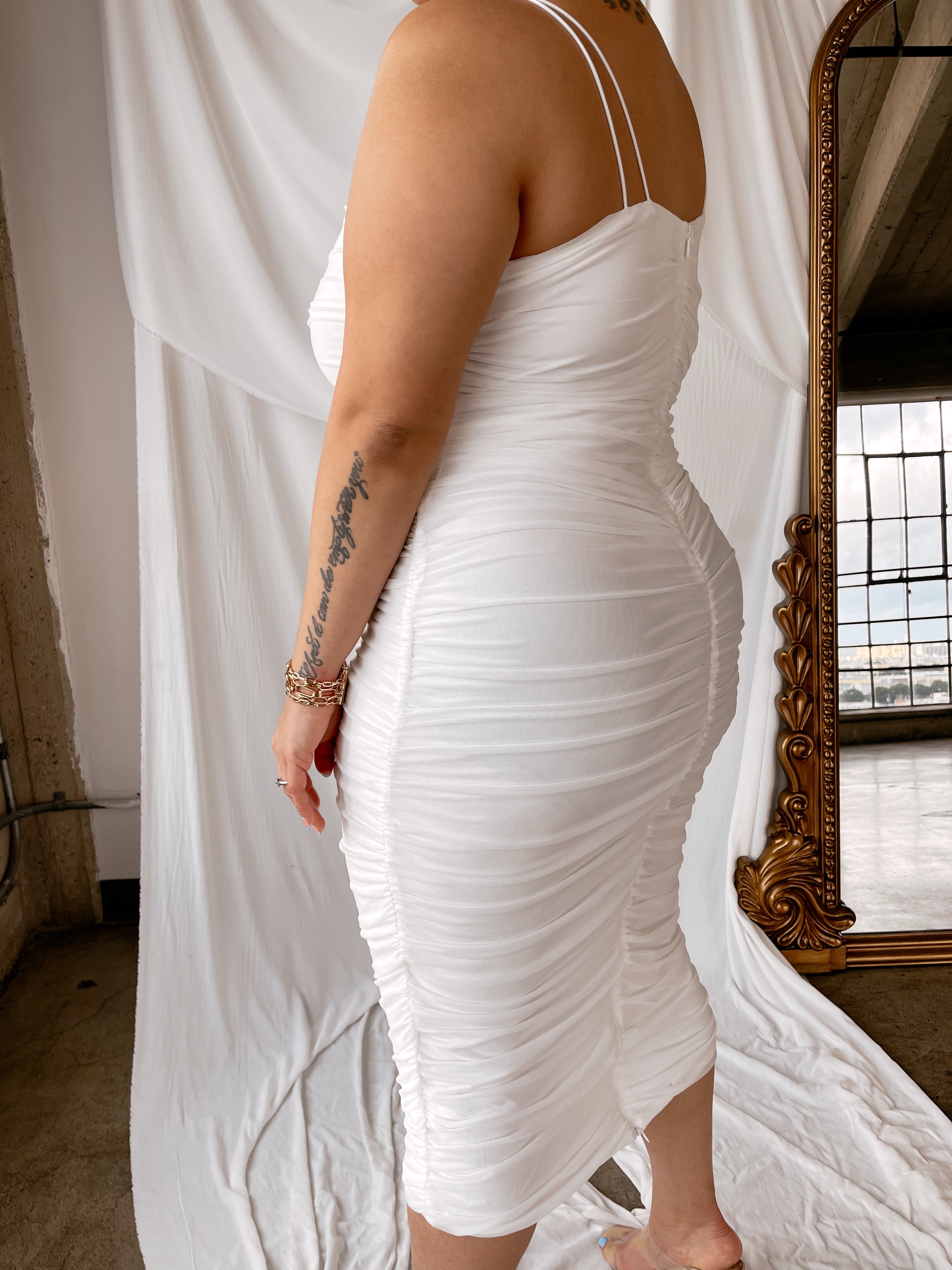 This dress is serving BODY. Fully lined and ruched, JADE features a stretchy mesh fabric that will hug your figure in the most flattering way. Double thin spaghetti straps that stretch and zip up closure. Also has a slit at the bottom that can be zipped up. Style this with clear heels or strappy sandals!