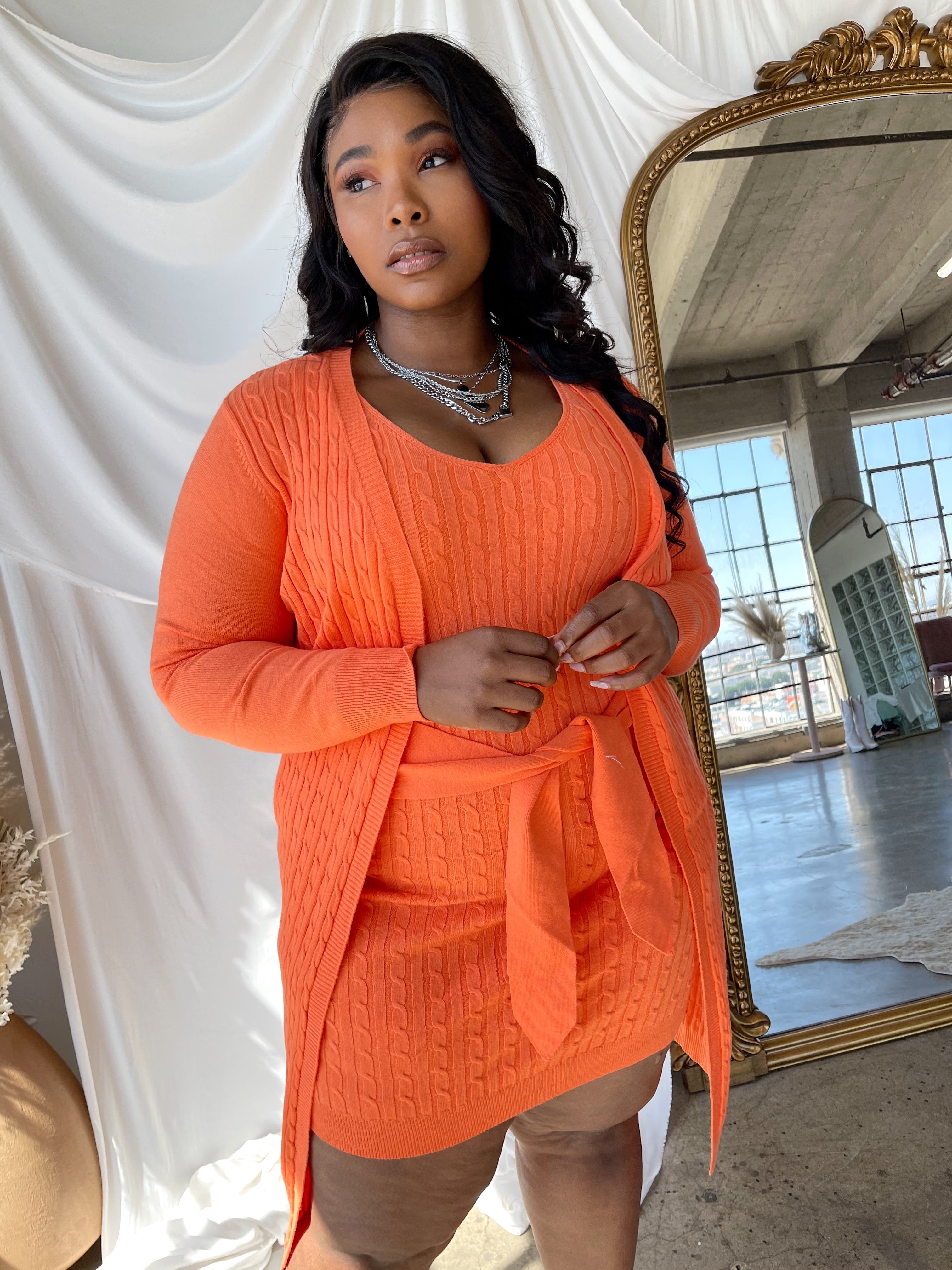 Orange is the new black in the KIRA. A must have for any wardrobe, features a sweater vest dress with a tie and a matching Cardigan. We paired it with chocolate brown heels, but can be styled together or separate.