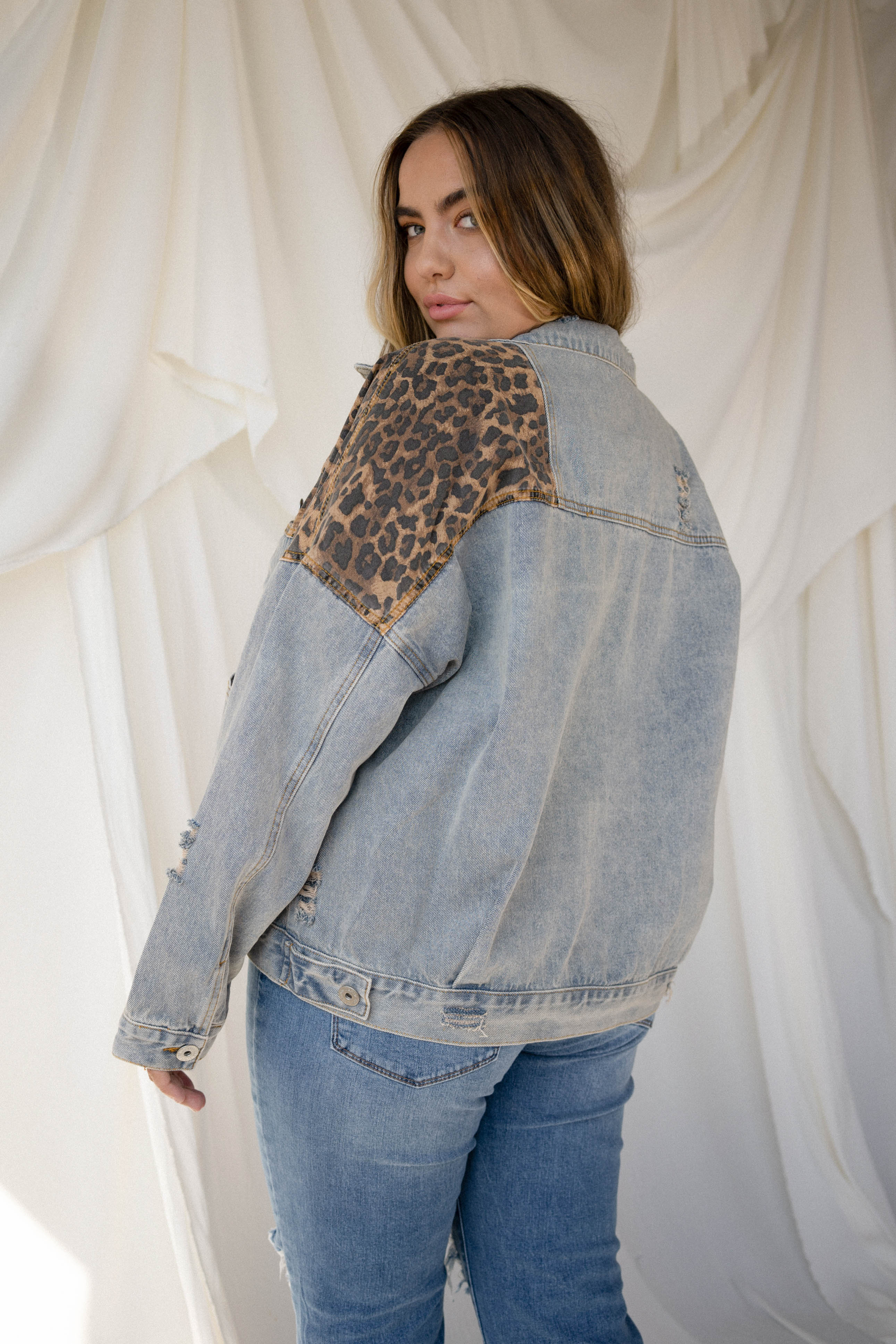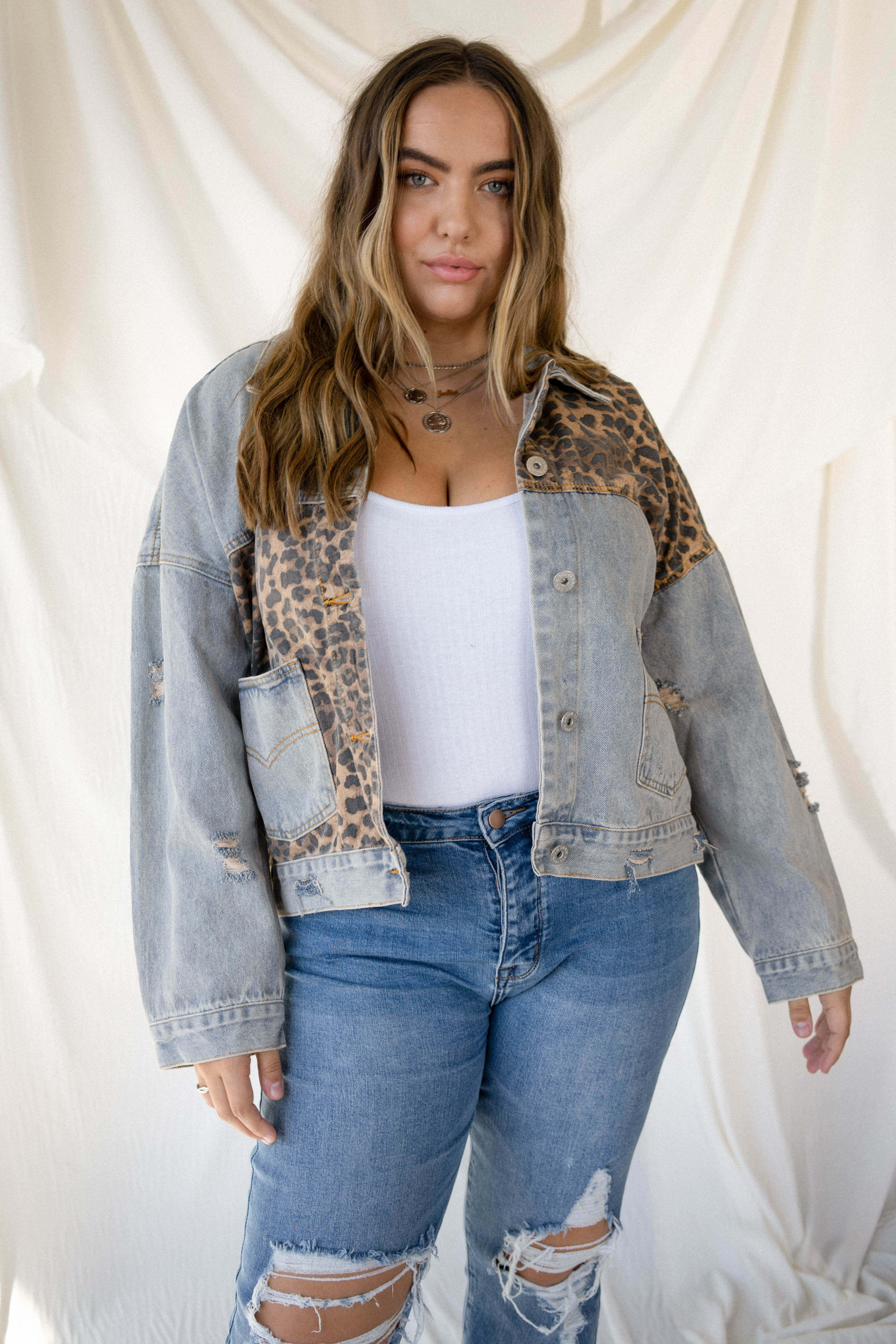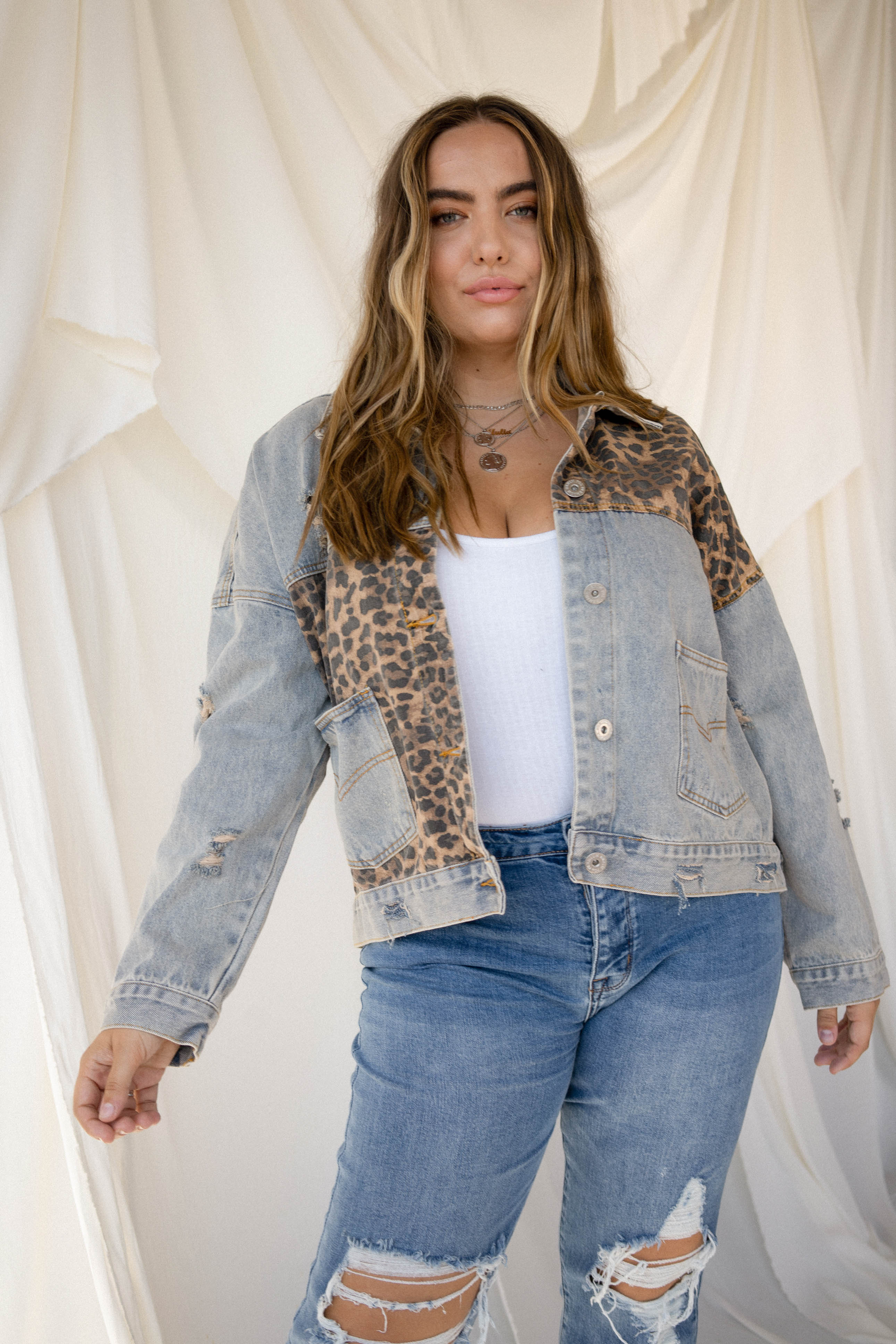 The all new OFF DUTY Denim jacket features Leopard print panels and a relaxed oversized fit. Collared with front button closure that buttons at wrists. Throw this on over any outfit and you're ready to go!
