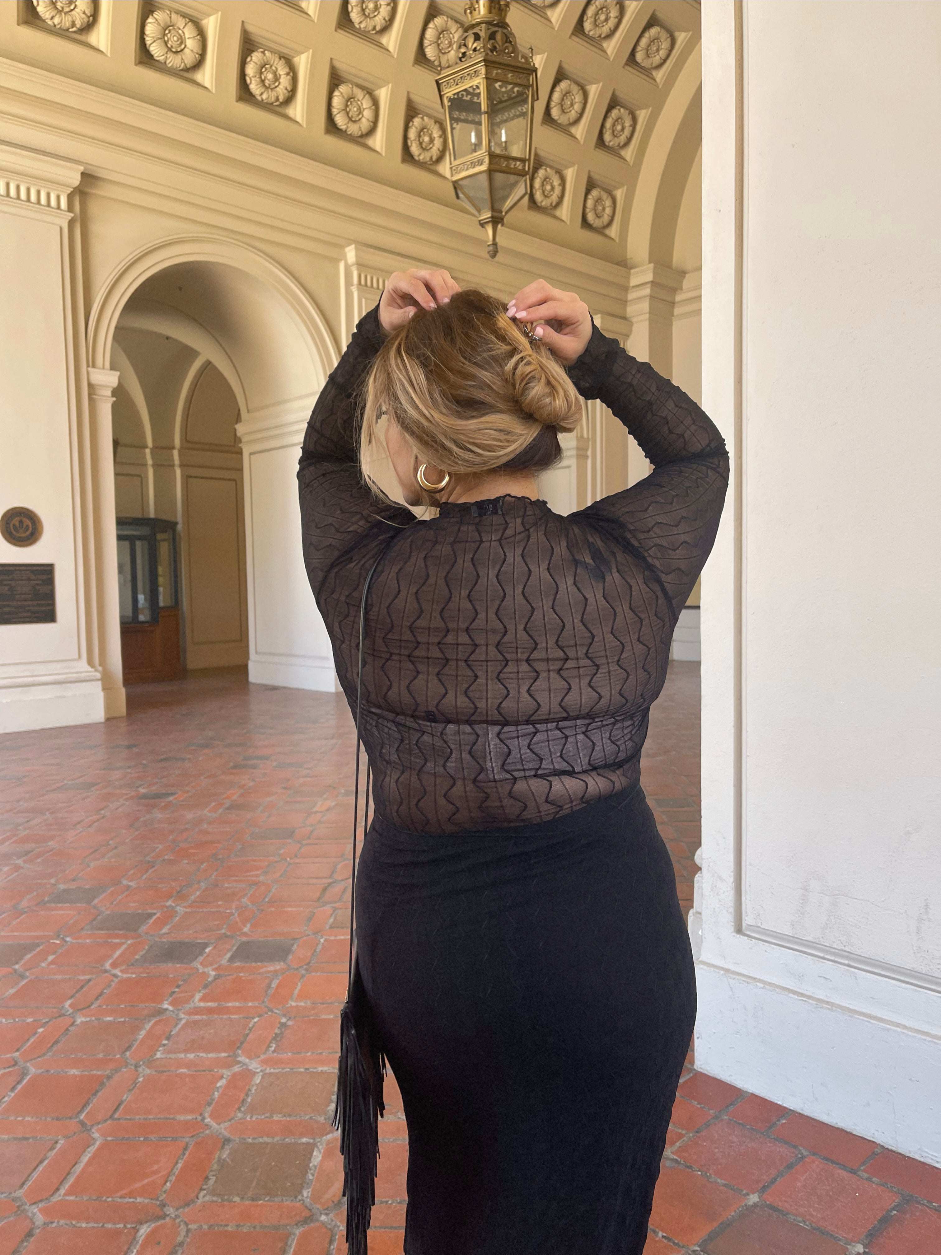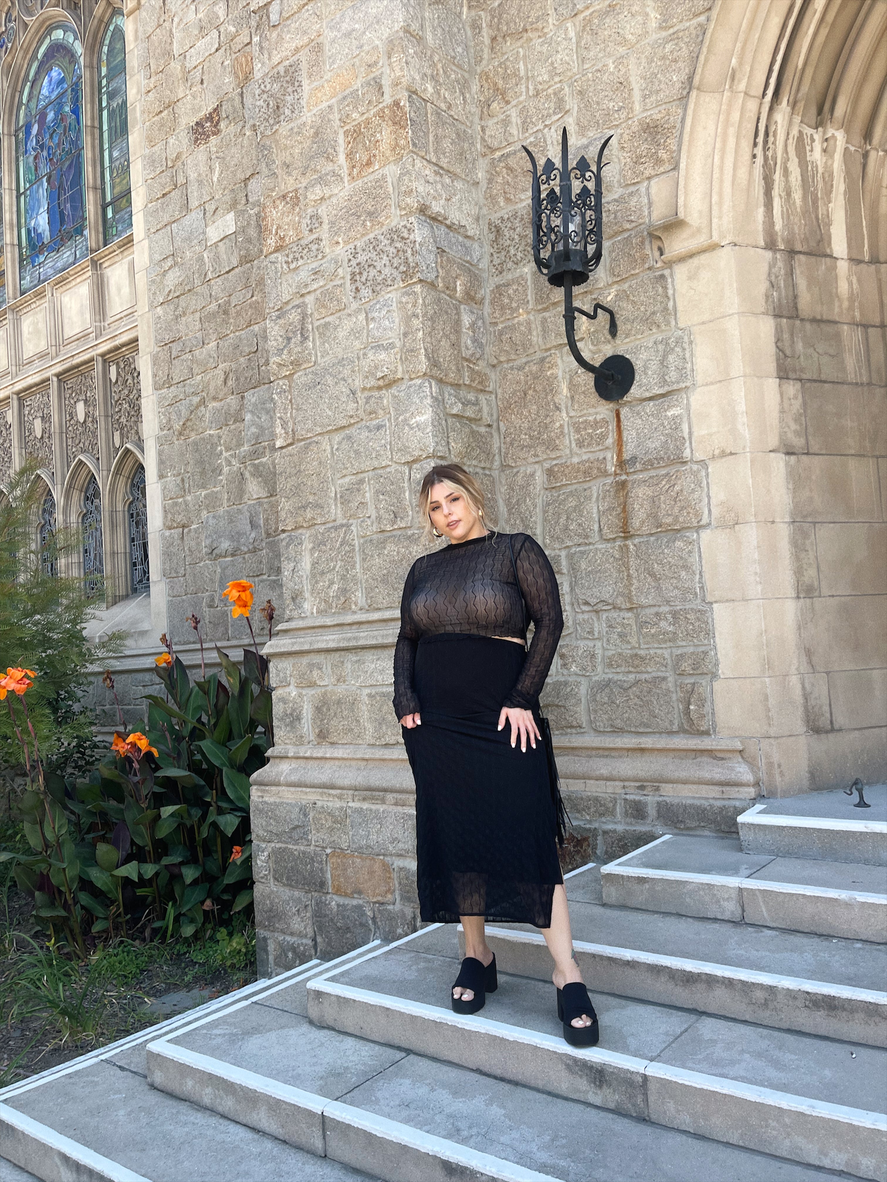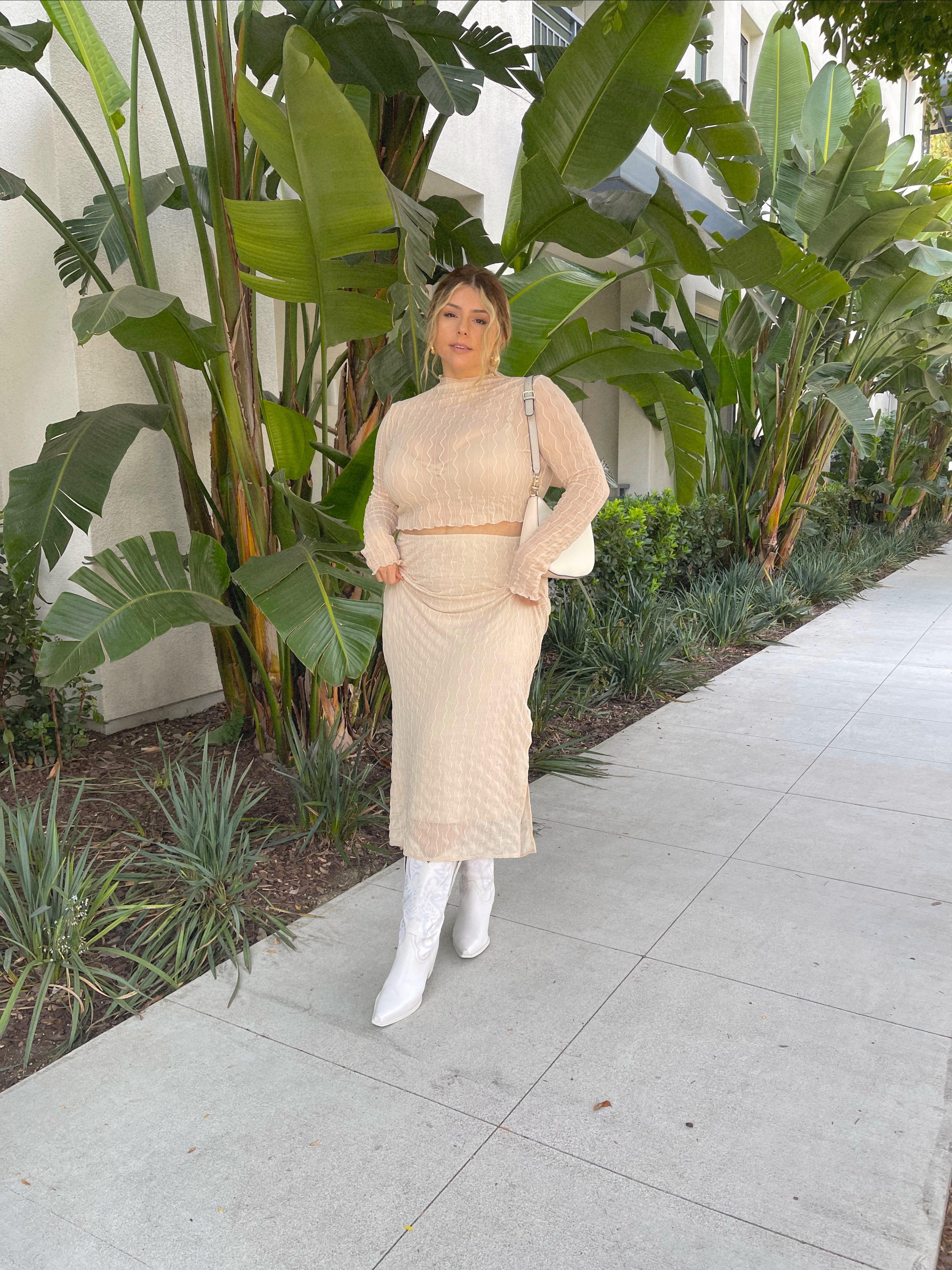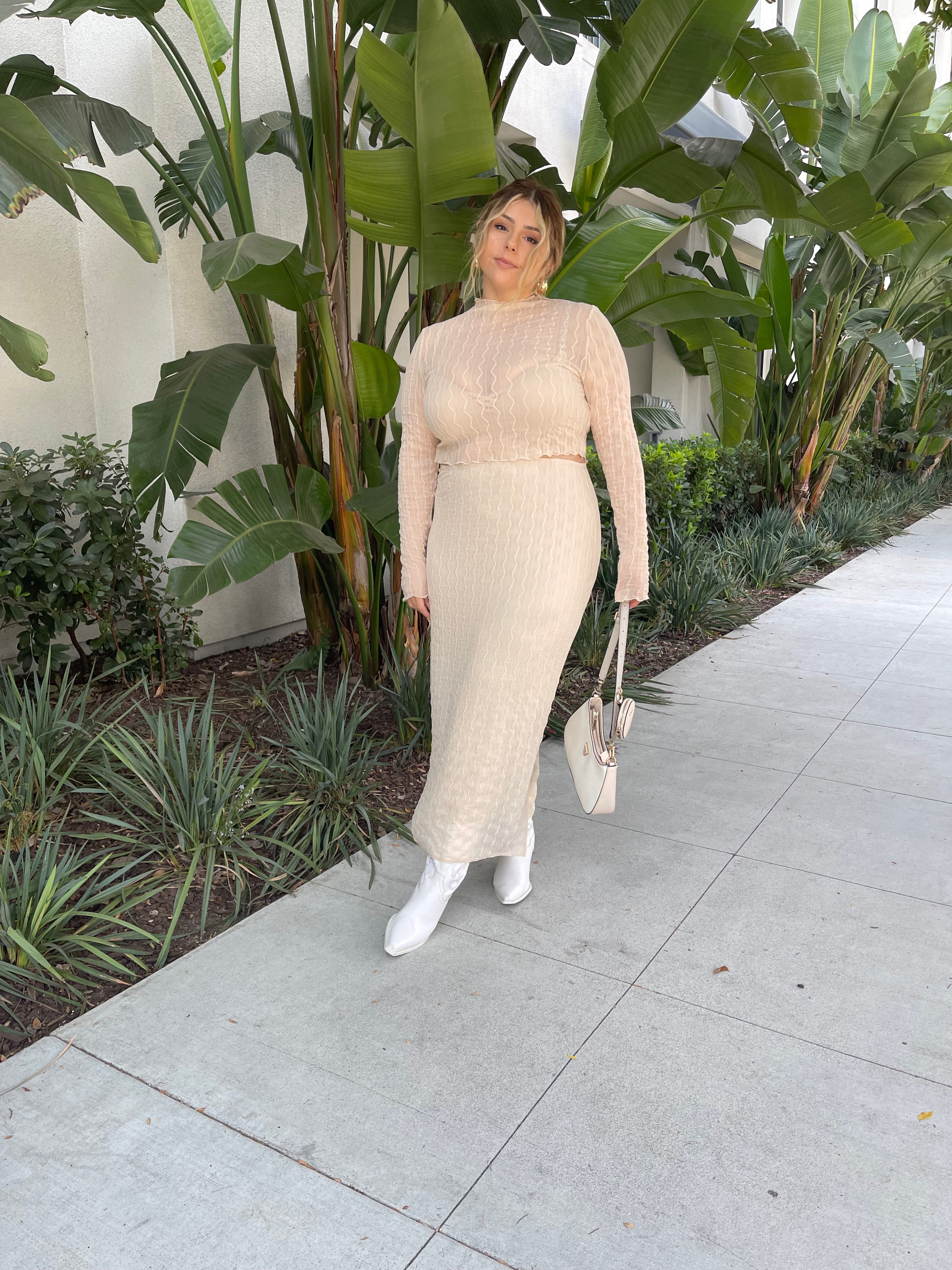 Take a daring plunge into luxury with the MALIBU Textured Set! This made-to-order masterpiece exudes daring and confidence with its jacquard mesh top and mesh maxi skirt with a side slit and full lining. Step up and stand out!