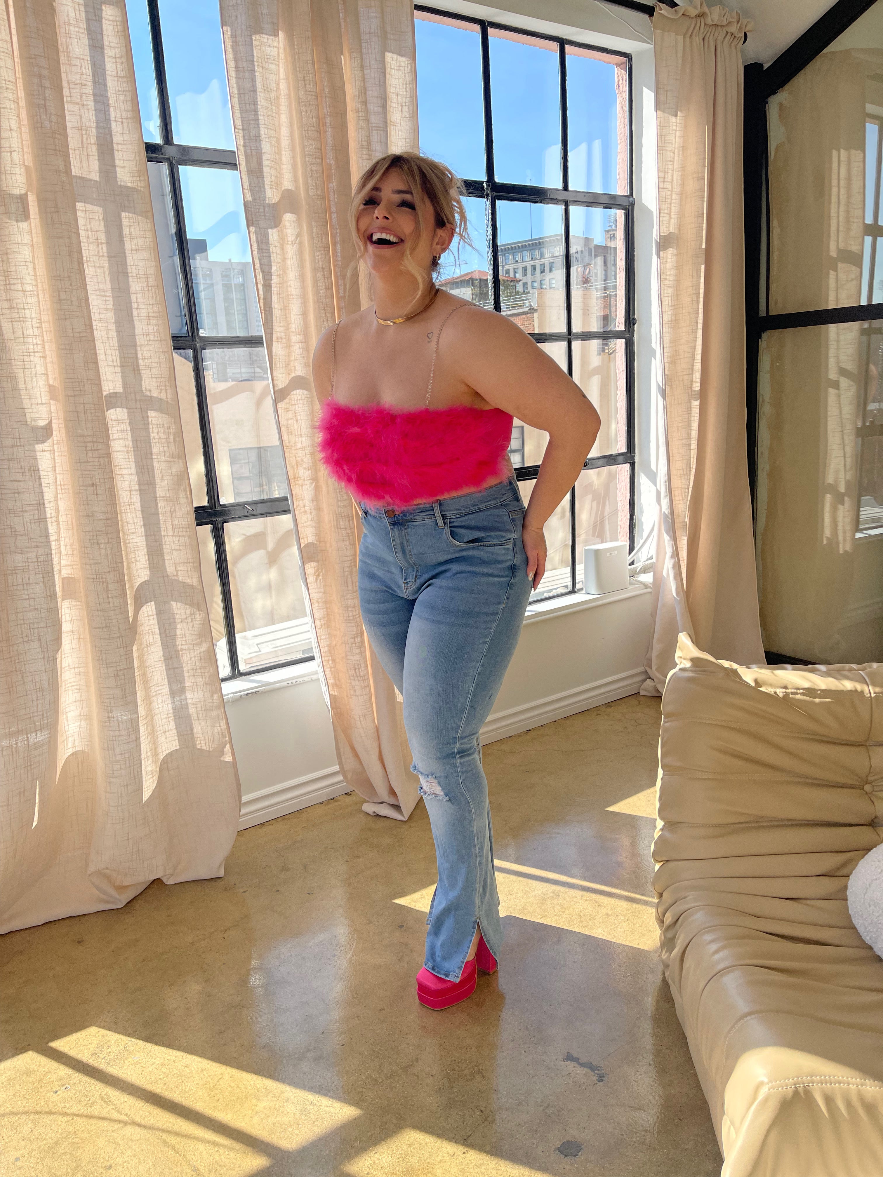 New style alert! Meet Stella, the perfect bootcut pant with a slit at the hem for the perfect detail. This stretchy denim has some distress on the knees, two front and back pockets with a zip fly closure. Dress them up or down!