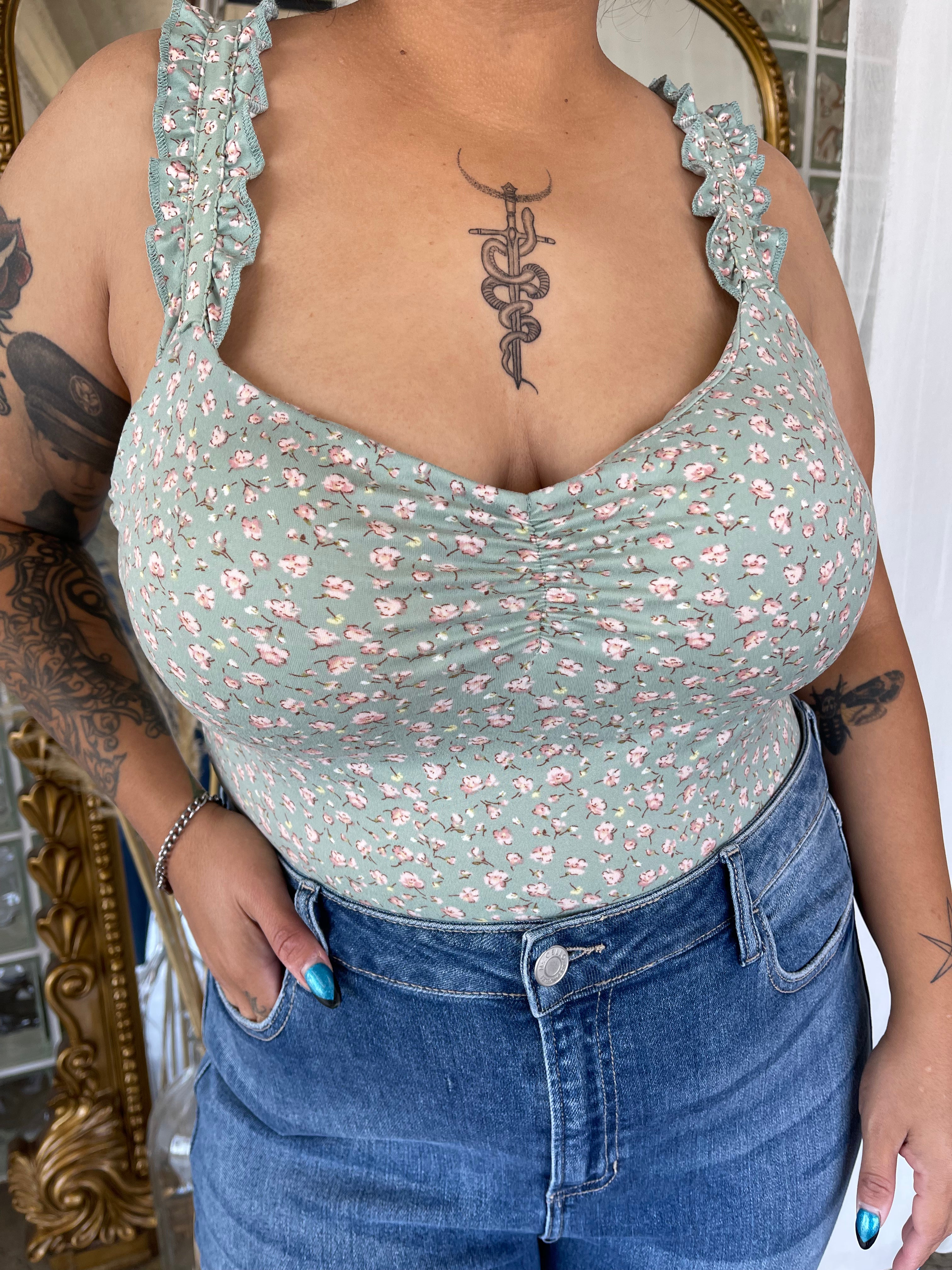 The perfect bodysuit just arrived! Very stretchy and soft fabric, built in pads with no wire. Features a ruffled cami design. Pair it with your fav denim or skirt!