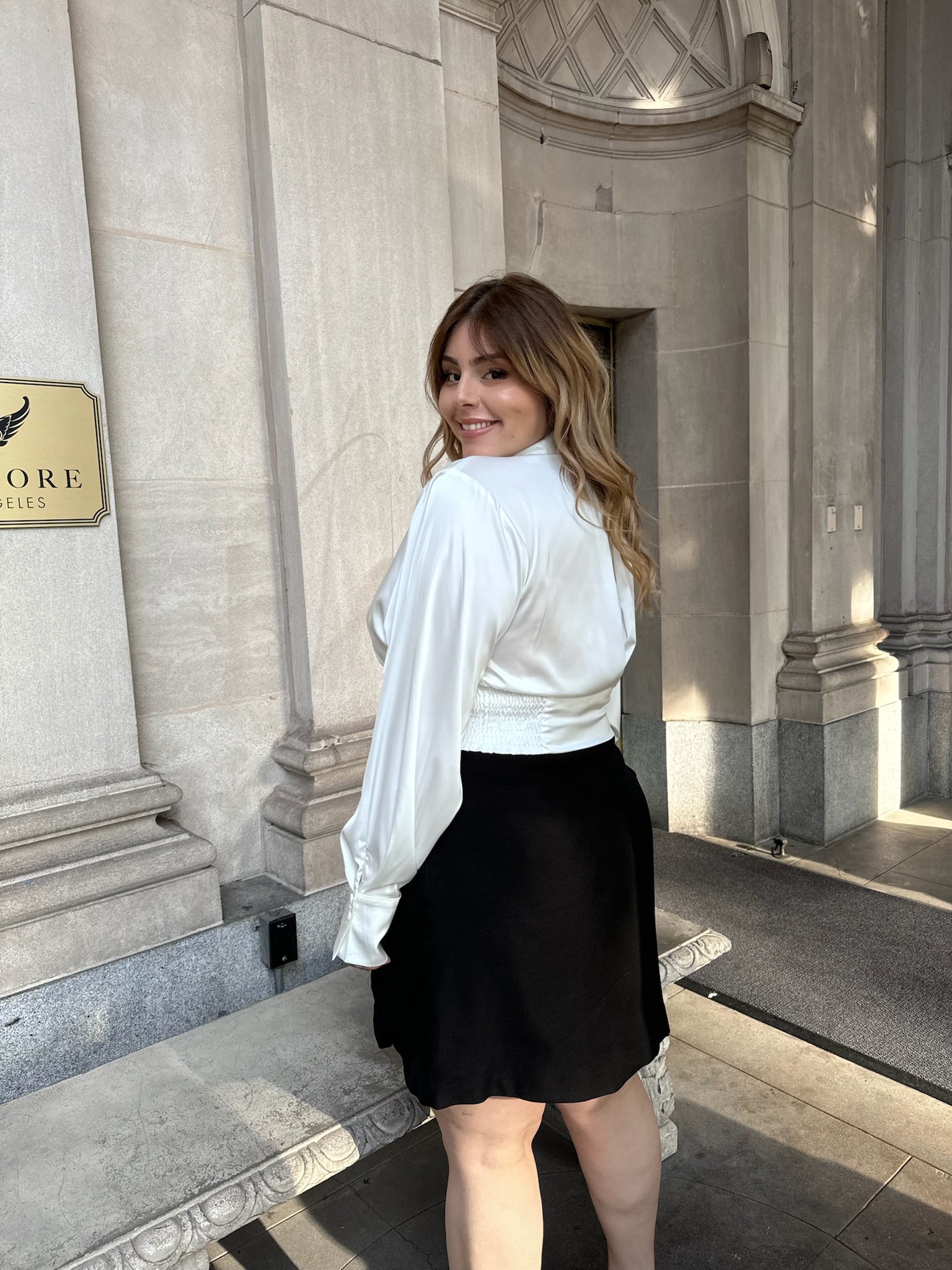 Dress to impress in our VIVIENNE Satin Cropped Blouse. Show off your style with a low neckline and balloon sleeves, while the ruching on the sides adds flattering definition. A button closure completes the look.