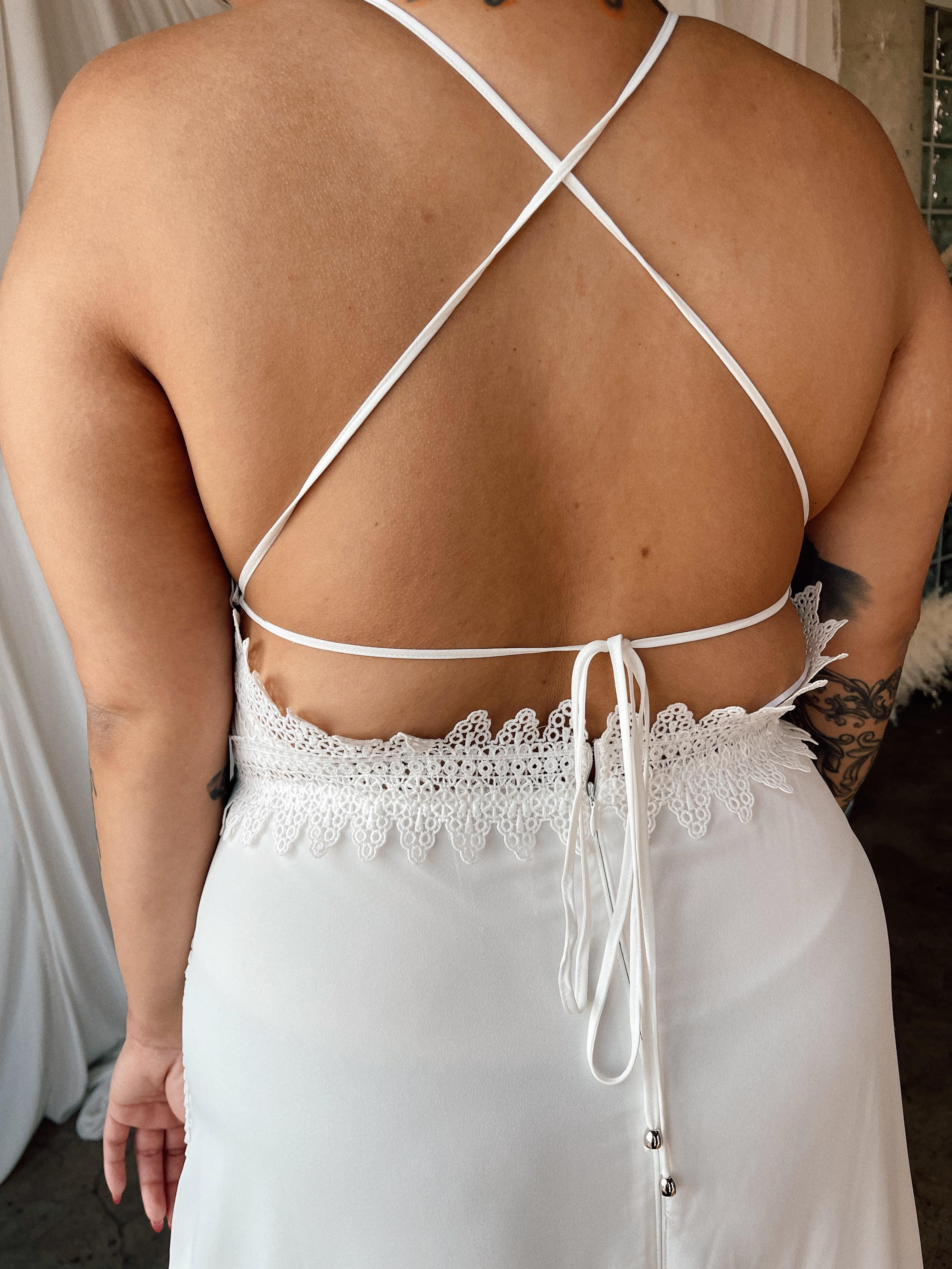 Lightweight woven fabric with Crochet Lace Trim, the WINSLET is the perfect dress for your next day or evening adventure. Open back design with zip up closure with clasp, adjustable tie straps, built in lining and Crochet Lace Trim design throughout.